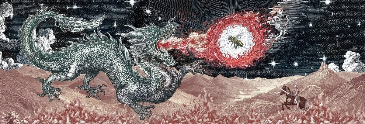 RING OF FIREは、勇気と神話を描いた物語です。ドラゴンが放つ炎は空に火の輪をつくり、その中心には、月の象徴としての蜂が浮かび上がります。その幻想的な光景に向かって、小さな騎士が剣を携え、今まさに立ち向かおうとしています。この構図は、ヨーロッパの宗教画や、ドラゴンに立ち向かう騎士の物語で知られる聖ゲオルギウス(英:セイント・ジョージ)の伝説に着想を得たものです。そしてそれは、『セイント・ジョージ』の愛称で呼ばれていた、養蜂家だった私の祖父へのオマージュでもあります。