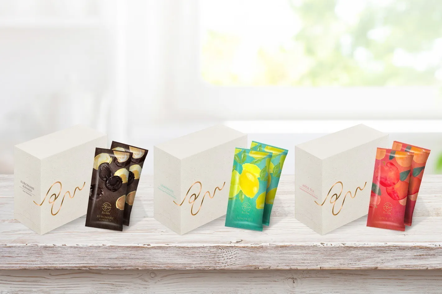 外箱はキッチンやリビング、オフィスなど、どんな場所にも自然と馴染むよう情報をそぎ落として、シンプルで上質な佇まいに。箱の開け閉めの手間を省き、1包ずつ下からスッと取り出せる形状に。