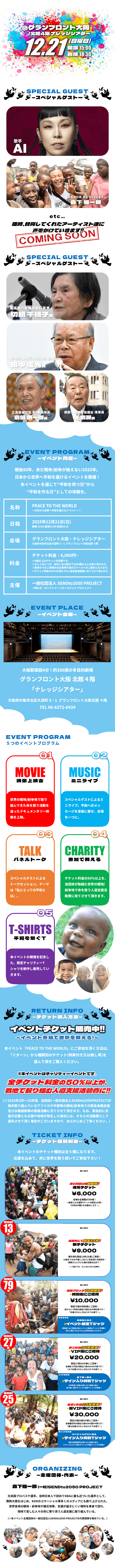 2025/11/13 12:02みなさま、あたたかいご支援を本当にありがとうございます。「PEACE TO THE WORLD」にたくさんの応援の声をいただき、心より感謝申し上げます。■ チケット枠の一部を調整しましたこのたび、企業様・団体様からのご支援により、**「企業席」と「グループ席」**を確保することができました!それに伴い、一般向けのチケットリターンの一部を調整し、全体の座席バランスを最適化させて頂きました。より多くの方々に快適にご参加いただける環境を整えております。ご理解・ご協力を心より感謝申し上げます。■ 新たに「応援枠」を追加しました!また、「当日は行けないけれど、イベントを応援したい!」という声を多数いただきました。そのお声にお応えし、**リターンなしの応援プラン(応援枠)**を新設しました。この枠には、チケットや特典はありませんが、PEACE TO THE WORLDの輪を広げるためにご支援いただく方々の想いを大切に、イベント当日の運営や制作費に充てさせていただきます。■ 今後について今後も、会場の準備の様子や出演者・チケット情報など、少しずつ進捗を共有させて頂きますので、どうぞ引き続き見守っていただけましたら幸いです。本イベントは、“PEACE”=誰かを想う温かい心“WORLD”=日常にある繋がりをテーマに開催いたします。一見、遠い存在のように感じる「PEACE」や「WORLD」という言葉が、日常に寄り添う、やさしいテーマとして心に届くよう 準備を進めています。この日、平和を願う多くの方々の想いが集まり、本イベントが “誰かを想う心でつながる” あたたかな一日となるよう、チーム一同、心を込めてつくり上げてまいります。引き続き、どうぞよろしくお願いいたします。 もっと見る