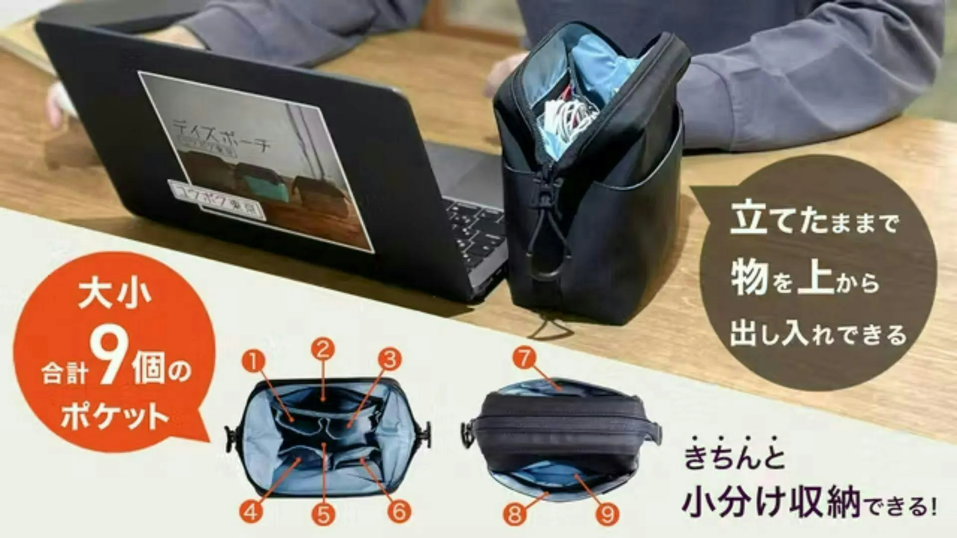 またメインポケットを中心に大小9つのポケットを配置。ガジェットごとに分けて収納できて大変便利なガジェットポーチです。