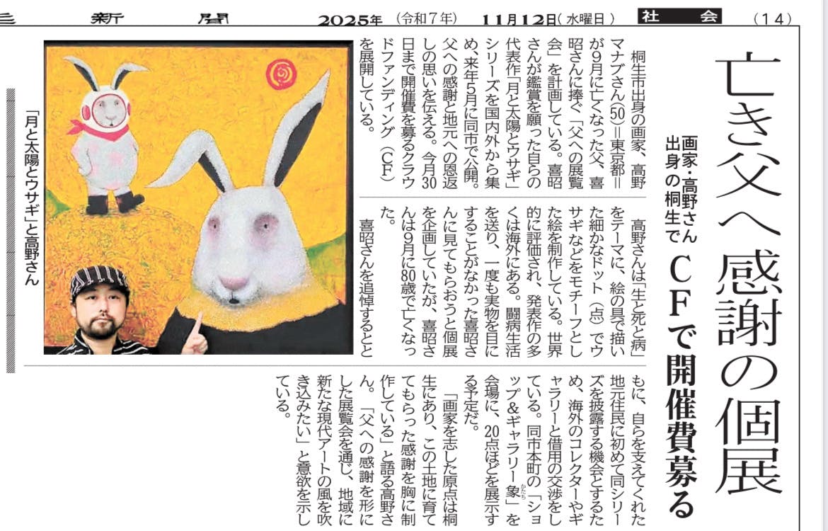 ご支援者の皆さま、いつも熱い応援をいただきありがとうございます。画家・美術家の髙野学です。この度、地元・群馬県の上毛新聞(本日11月12日付)に、私のクラウドファンディングと「父への展覧会」に関する取材記事が大きく掲載されました!「亡き父へ 感謝の個展 CFで開催費募る」という見出しで、プロジェクトの核心を報じてくださっています。紙面には、17年間の人工透析と闘った父への追悼の想い、そして故郷・桐生への感謝を込めた「月と太陽とウサギ」の作品が大きく取り上げられています。これまでの地元FM桐生様や、他の新聞社様からの取材、そして「願いうさぎ」様からの高額支援に続き、群馬県全域に影響力を持つ上毛新聞様が報じてくださったことは、最大の追い風です。残りわずかとなったこの挑戦を、必ずや成功させ、父との約束(生前に見せる予定だった個展)を果たします。地元紙に掲載されたというこの勢いを止めずに、目標達成まで一気に駆け抜けます。引き続き、新聞記事を見た方へのご紹介や、SNSでのシェアなど、皆さまの応援を何卒よろしくお願い申し上げます!▼プロジェクトページはこちらからhttps://camp-fire.jp/projects/889988/view