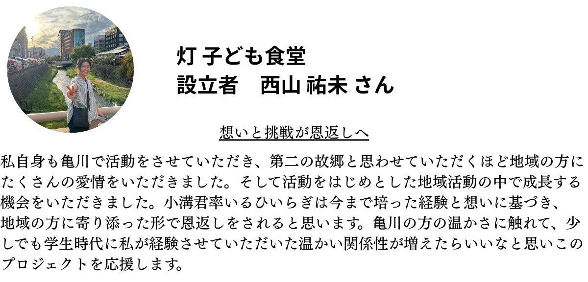 私自身も亀川で活動をさせていただき、第二の故郷と思わせていただくほど地域の方にたくさんの愛情をいただきました。そして活動をはじめとした地域活動の中で成長する機会をいただきました。小溝君率いるひいらぎは今まで培った経験と想いに基づき、地域の方に寄り添った形で恩返しをされると思います。亀川の方の温かさに触れて、少しでも学生時代に私が経験させていただいた温かい関係性が増えたらいいなと思いこのプロジェクトを応援します。