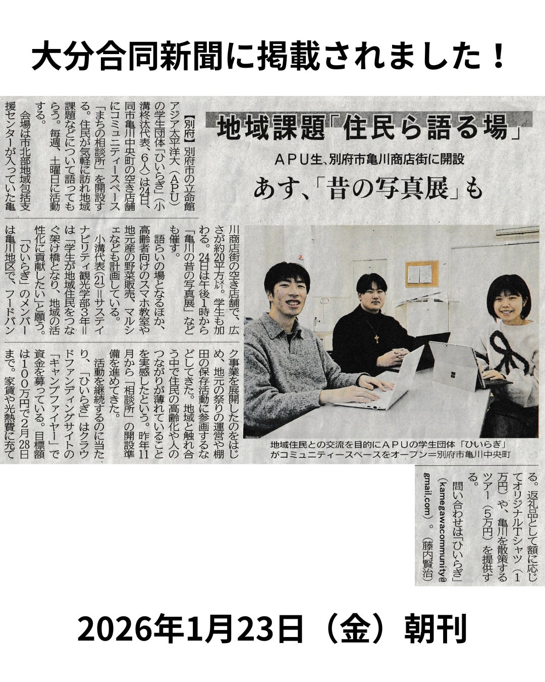 1月23日(金)の大分合同新聞の朝刊に掲載していただきました!