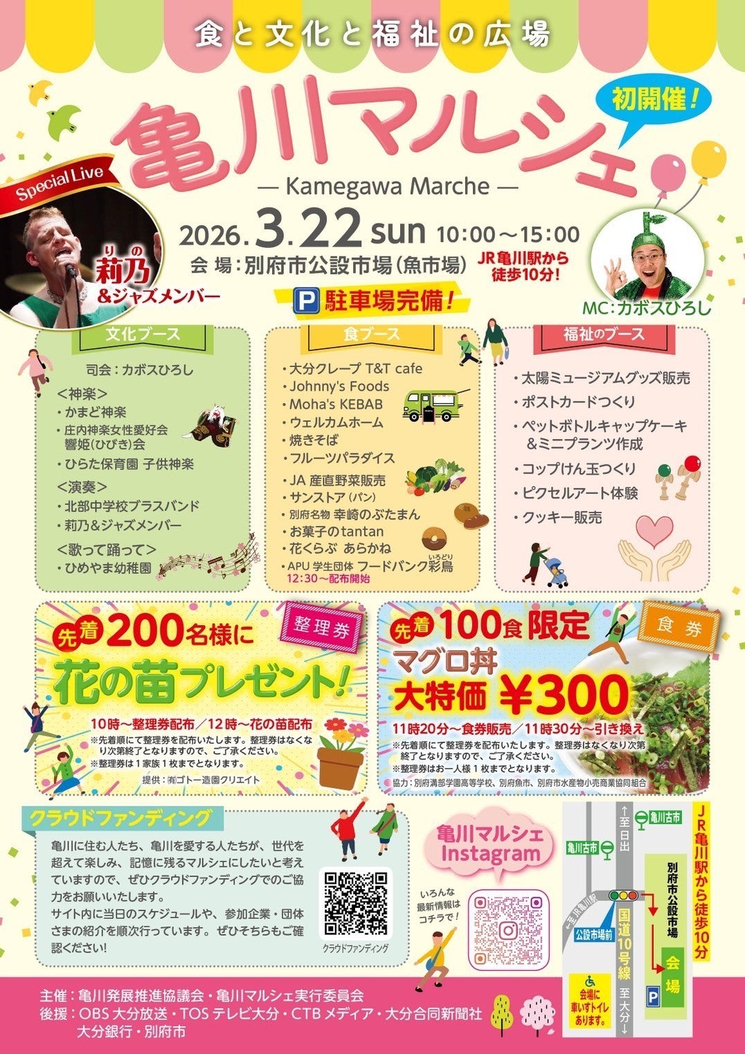 3月22日(日)に別府市公設市場で亀川マルシェというイベントが開催されます!花の苗プレゼントやお得なマグロ丼など魅力的なコンテンツが用意されていますね。食と文化と福祉の広場ということで亀川にゆかりのあるステージや出店が用意されるとのことです。