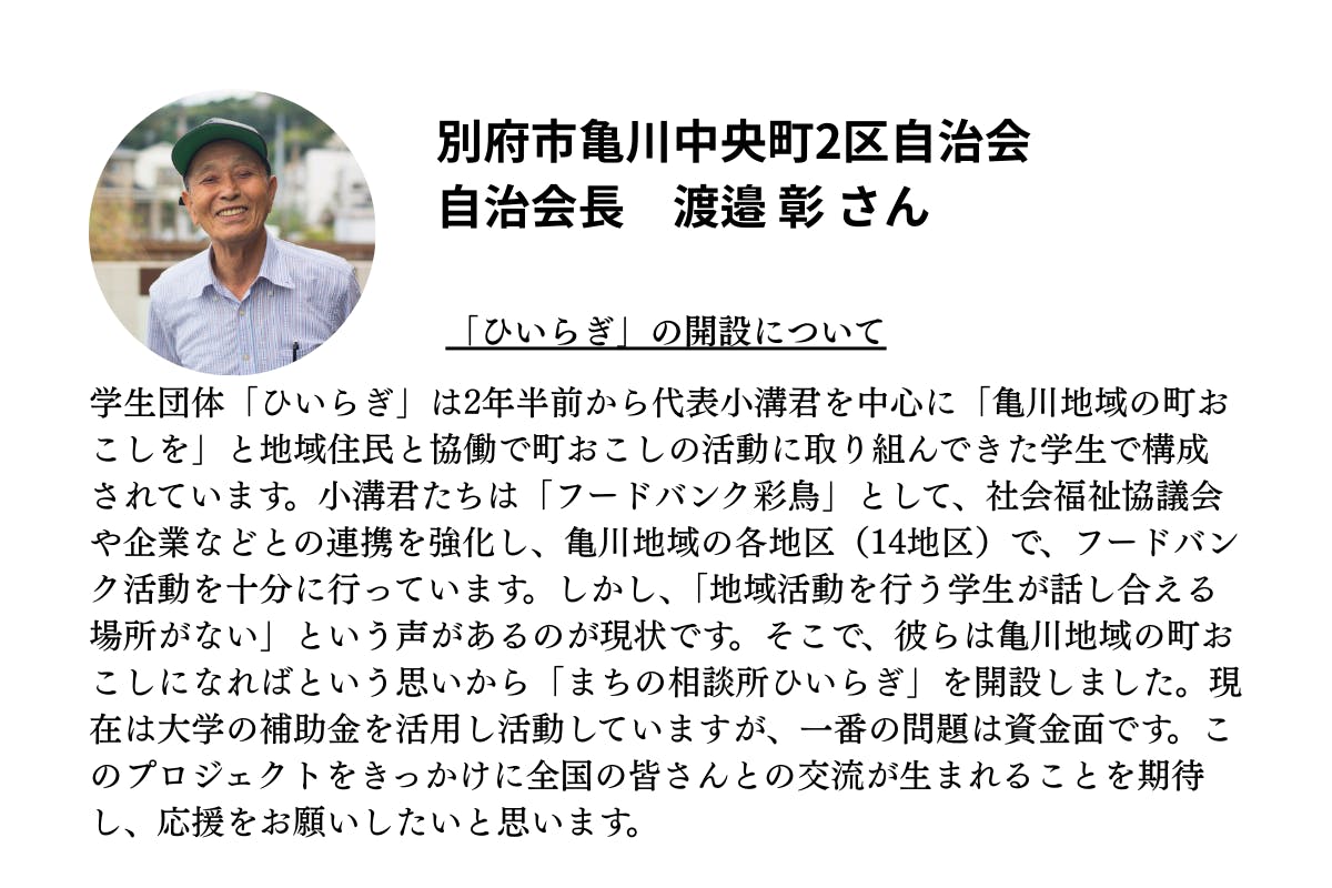 私たち学生団体「ひいらぎ」は別府市亀川商店街の空き店舗を活用し、「まちの相談所・ひいらぎ」を作ります。その背景には、「亀川」の地域活動の担い手の高齢化という課題があります。交流拠点をつくり、「まちの相談所」として機能させることで高齢化の課題を中心に地域の小さな課題を複合的に解決します。