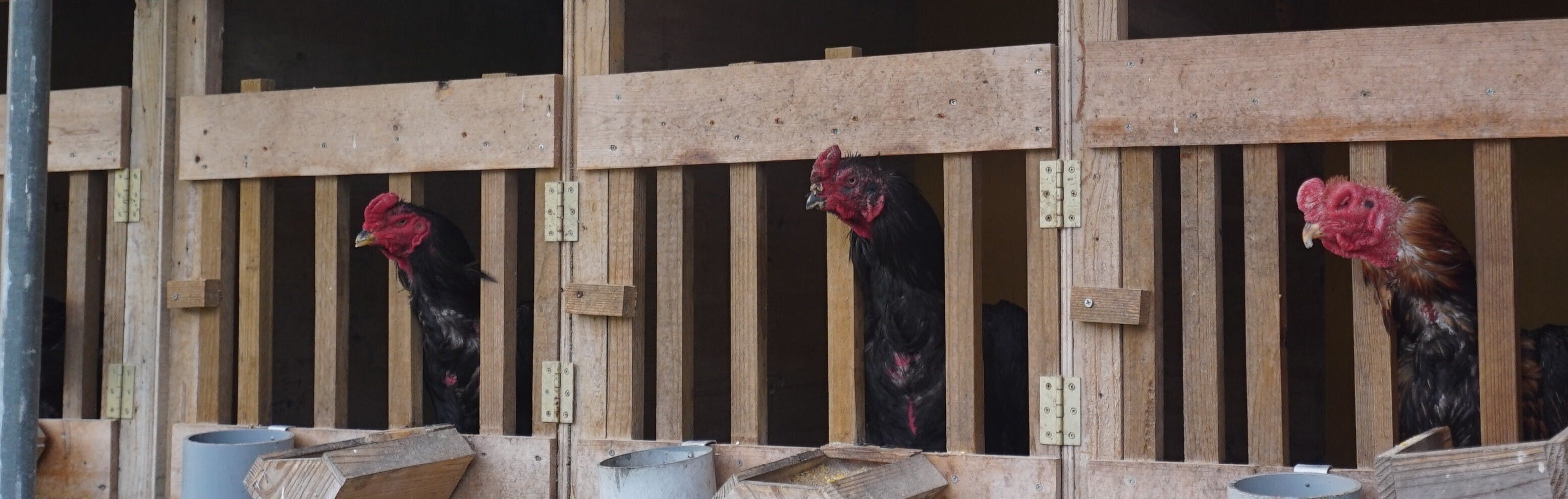 傷だらけで、下くちばしを切られた軍鶏たちが