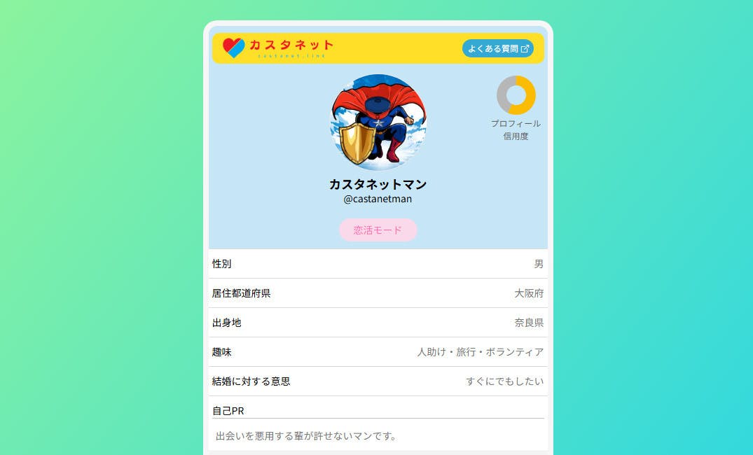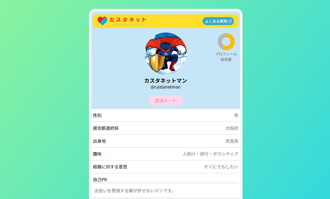 カスタネットは「美人局」や「色恋営業」「既婚者による独身語り」などが連日メディアを賑わせる中、出会いの信用情報サービスとして開発された、基本無料の恋活・婚活用オンライン名刺サービスです。