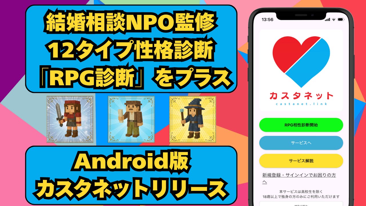 2025/12/22 15:36カスタネットの企画・監修を担当しております結婚相談NPOの影山でございます。もう少しこちらにご報告すべきなのだろうか‥と思いつつも、やはり手を動かすべきだなと判断して参りました。本日、ようやくAndroid版のカスタネットをリリースできましたのでそのご報告となります。最近、日本人のAndroid比率もかなり増えているようですが、今回の件は、そういったシェアの問題以上に大きな出来事で、これでようやく協業のご提案がしやすくなったというのが大切な部分です。例えば、少し前にこのような発表をしています。年収200万円時代の婚活に真剣に取り組んでいる我々的には、婚活者の負担を少しでも下げたいという想いがあり、カスタネットの「身分証明書」機能を提示した方に対する何らかの割引を提供してくださいませんか?と呼びかけている訳です。例えば、お見合い写真撮影や、お見合い前による美容室、プロポーズに適した飲食店、お見合い用に席をセッティングいただける地方のカフェなども想定しています。身分証明書機能は本人確認が済んでいる会員にしか利用できない機能で、不要な個人情報(枝番までの住所など)を隠した上で恋活・婚活中であることを示す事が出来ます。こういった協力提案を全国の皆様にお願いするのですが、これまでウェブで「カスタネット」と検索してもなかなかカスタネット公式サイトが表示される事はありませんでした。(「カスタネット 婚活」といった複合キーワードならば可)今後は、iPhoneのAppStore、AndroidのGooglePlayストアなどで見つけやすくなりましたので、信用度も少し上がってくれるだろうということです。年末になってしまったのでtoB向け提案は年始まで控えますが、来年は仕切り直して頑張っていきたいと思います。 もっと見る