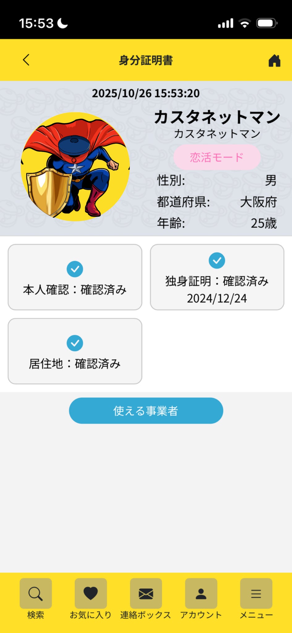 身分証明書機能は本人確認が済んでいる会員にしか利用できない機能で、不要な個人情報(枝番までの住所など)を隠した上で恋活・婚活中であることを示す事が出来ます。