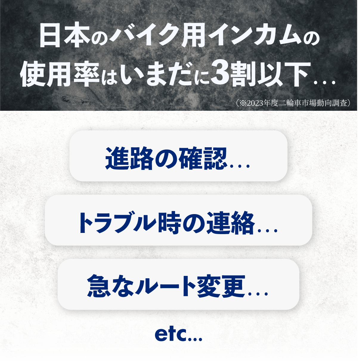 などの時に連絡が取り合えないと、何かあったときに対応できないリスクを抱えることになります。ではなぜバイク用インカムが普及していかないのでしょうか…