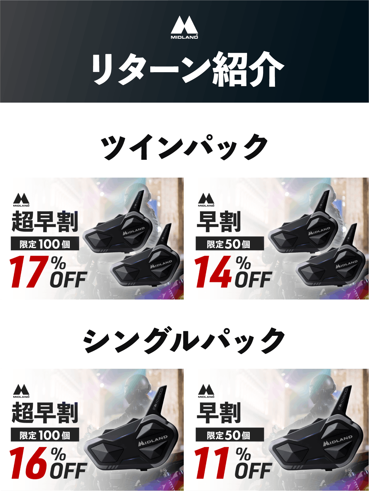 などが原因であることが分かりました。創業60年以上、世界90か国以上で信頼されるグローバルメーカーMIDLANDが送るBT R1 Xは、これらの課題を解決する自信を持ってお届けできるバイク用インカムです。