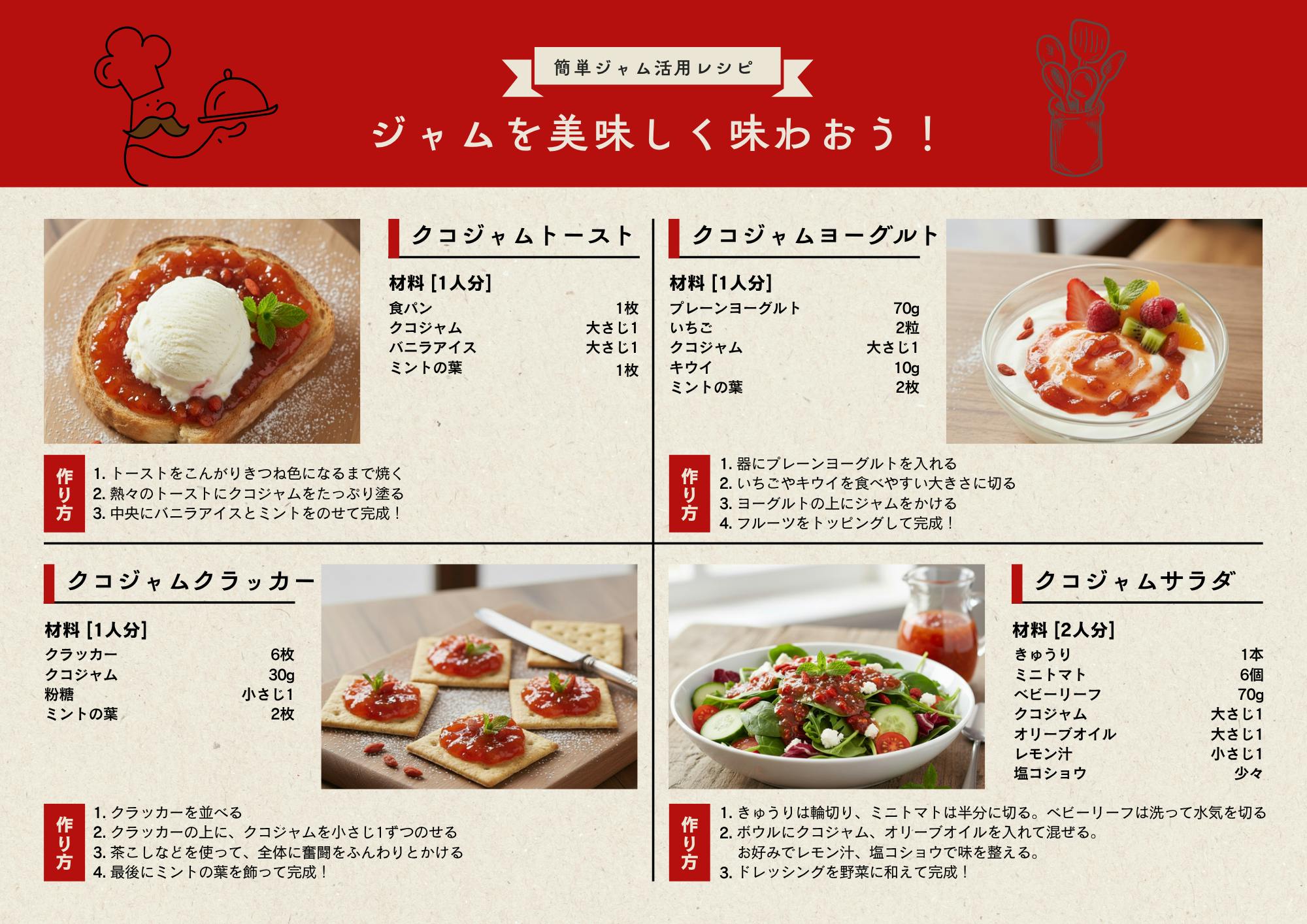 クコの実ジャムは、そのまま食べるのはもちろん、いろんなアレンジで毎日の食卓を彩ります!そこでクコの実ジャムを使ったレシピをいくつか紹介したいと思います!