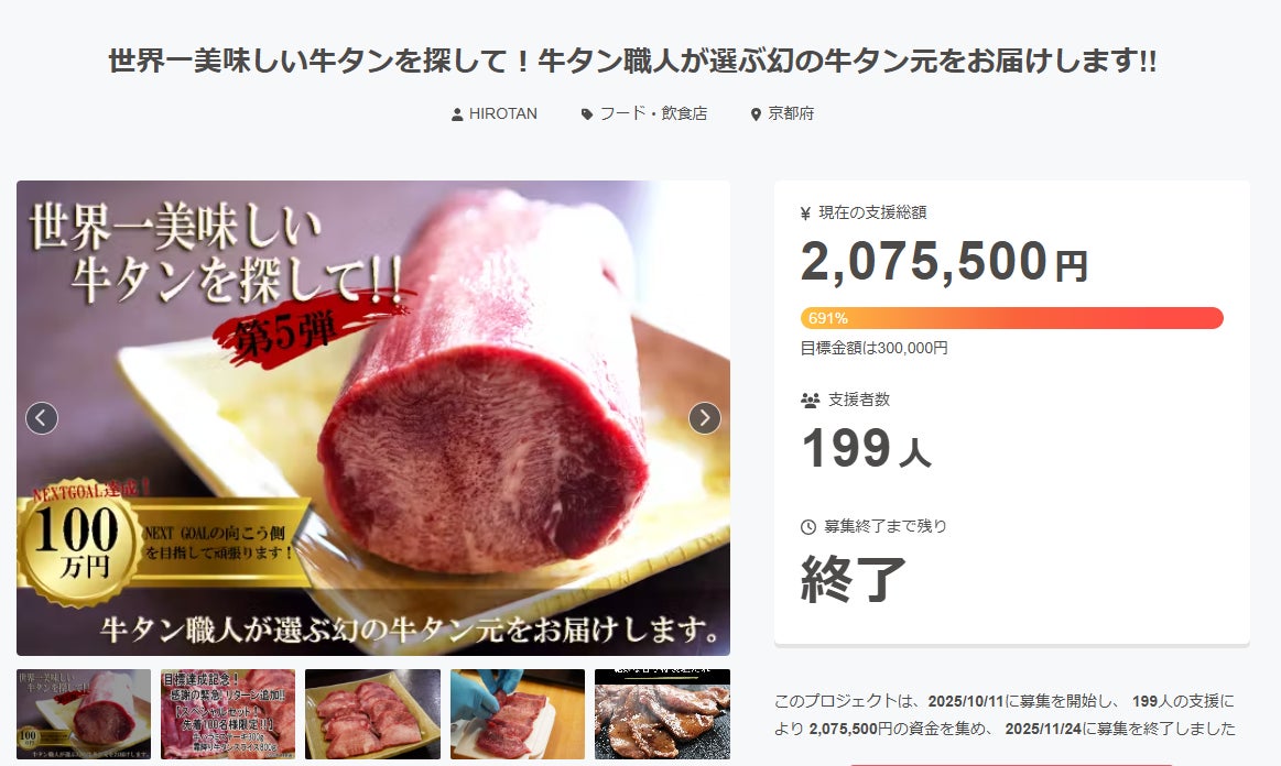 2025/12/12 14:14【世界一美味しい牛タンを探して!牛タン職人が選ぶ幻の牛タン元をお届けします!!】先日、無事SUCCESSにて終了したこちらのプロジェクト。先着50名様限定!!2025年内発送分、牛ハラミ&牛タンのスペシャルセット達が、日本全国津々浦々のご支援者の皆様の元へ旅立っていきました。こちらのリターン商品のためだけに用意された牛ハラミと、牛タン職人厳選の牛タンをお召し上がりくださった皆様を牛タン笑顔にしてくれると祈って・・・。元気いっぱい行ってらっしゃい!!商品到着までどうぞ今しばらくお待ちくださいませ^^ もっと見る