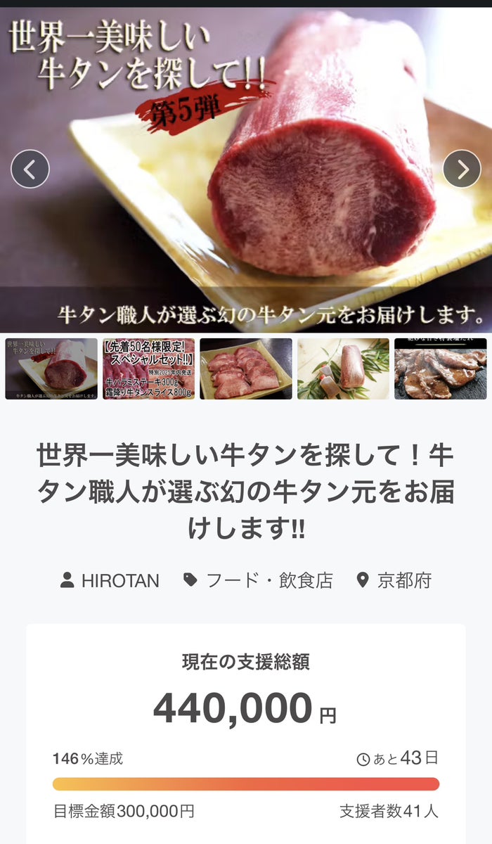 世界一美味しい牛タンを探して!牛タン職人が選ぶ幻の牛タン元をお届けします!!第5弾10/11(土)0:00開始から多くのご支援を賜り、初日の17時の時点ですでにプロジェクト目標達成することが出来ました。これもひとえにご支援、応援してくださったみなさまのおかげです。スタッフ一同心よりお礼申し上げます。まだプロジェクト期間も残っておりますし、NEXTGOAL設定してみたり、特別にリターン商品追加してみたり、いろいろ挑戦してみようかななんてことも考えてたりしますので、ぜひまたチェックしていただけますと幸いです。まずは目標達成のお礼をば。