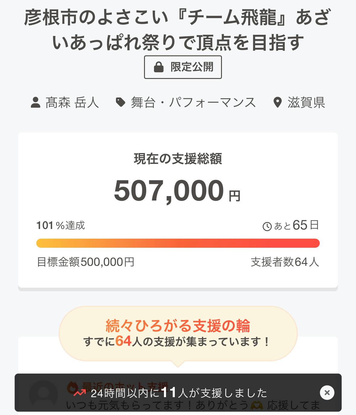 2025/11/29 19:32皆さまこのたび、チーム飛龍のクラウドファンディングは、おかげさまで第一目標金額を無事に達成いたしました。温かいご支援と応援の声に、心より感謝申し上げます。本当にありがとうございます。ここから先は、少しだけ今回のクラファンの“設計”についてお話をさせてください。というのも、きっと多くの方が「達成したのに、どうしてまだ支援を募るの?」と感じられる部分かと思います。結論から申し上げると、今回の第一目標は、最終到達点に向かうための “中間目標” として設定していたためです。初動の達成率をきちんと示し、皆さまからの応援を見える形にすることで、より多くの方に「この挑戦は前に進んでいる」と安心していただく──この目的が強くありました。しかし、実際に次回大会に向けて準備を進めるためには、 • メンバー衣装一式:100万円超え • オリジナル楽曲制作:35万~40万円 • 大道具・小道具の適正制作:50~60万円 • 合計すると、200万円を超える規模 になりますなど初期設定の目標だけではどうしても届かない部分が残っています。そのため、「次のステップであるネクストゴール(第二目標)」を設定し、最終的に必要な水準へ近づけるための挑戦を続けさせていただくことにいたしました。もちろん、すでにご支援いただいた皆さまには、現時点だけで十分すぎるほどの応援を頂戴しています。そのうえで、「飛龍の次のステージを一緒に見届けたい」「あと一歩なら力になりたい」と感じてくださるお気持ちがあれば、次の目標に向けて応援いただけると大変心強く思います。目標達成はゴールではなく、“本来のゴールへ到達するための折り返し地点”。皆さまのお力を未来につなげられるよう、引き続き誠実に、一歩ずつ積み上げてまいります。改めまして、心よりの御礼を申し上げます。そしてもしよろしければ、もう少しだけチーム飛龍の挑戦にお力添えいただければ幸いです。髙森より もっと見る