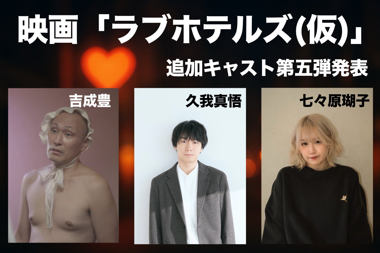 追加キャスト第五弾発表!第五弾は、第四弾とはまた違った幅広いジャンルで活躍されているキャストの方々です!!吉成さんのプロフィール写真は劇中の写真を使用させてもらいました。どんな役かお楽しみに!!吉成豊プロフィール1977年3月1日生まれ、広島県出身。フリーで小劇場を中心に活動。近年はMV、映画作品にも出演しています。久我真悟プロフィール1992年10月8日 栃木出身俳優|脚本家|演出家|男優|劇団theatre OLO(テアトル オロ)主宰2016年に医療職から俳優へ転身。以降、舞台を中心に・映画・ドラマ・ラジオ・CM等に多数出演。2018年「演劇ユニット愚者愚者」を結成。「性年バイバイ。」が、第20回杉並演劇祭にて、最高位の杉並演劇大賞を受賞。2023年に同ユニットを解散。2024年に「theatre OLO」を結成。主宰・脚本・演出を務める七々原瑚子プロフィール1997年3月15日生まれ。かつてセクシー女優として活動し、2020年末に引退。 引退後は舞台やピンク映画など女優業を続けている。