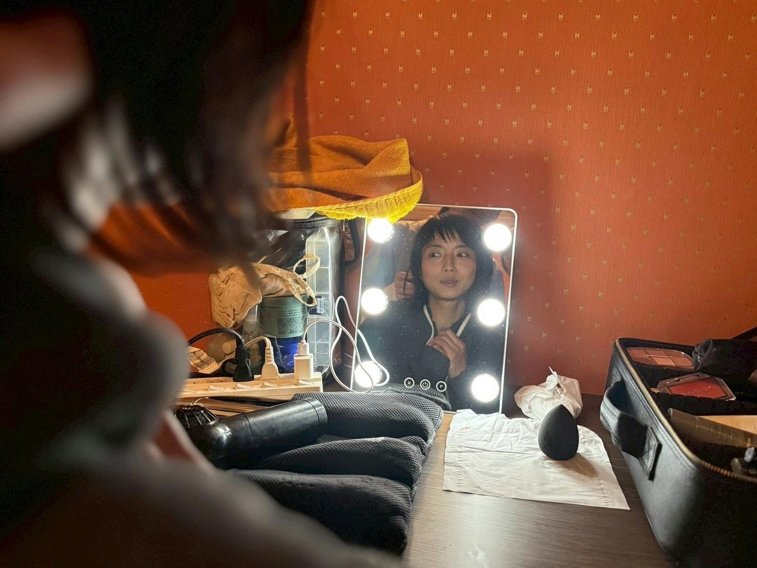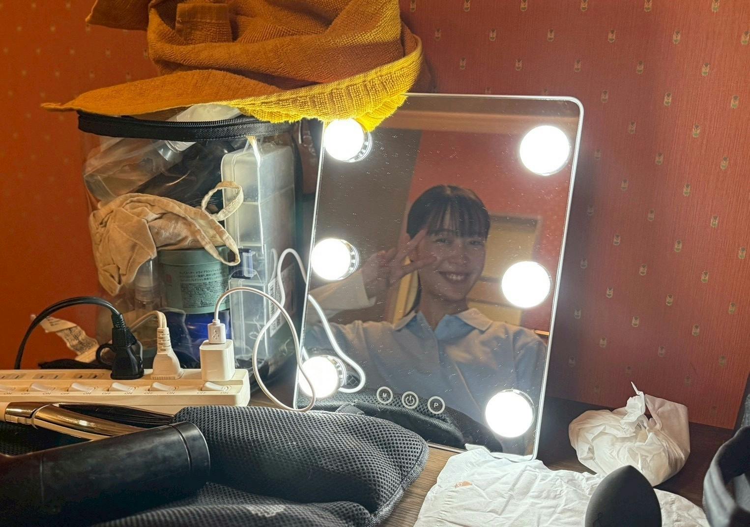 部屋の明かりは全灯状態でも暗いため、沢山照明をあててヘアメイクをしています。