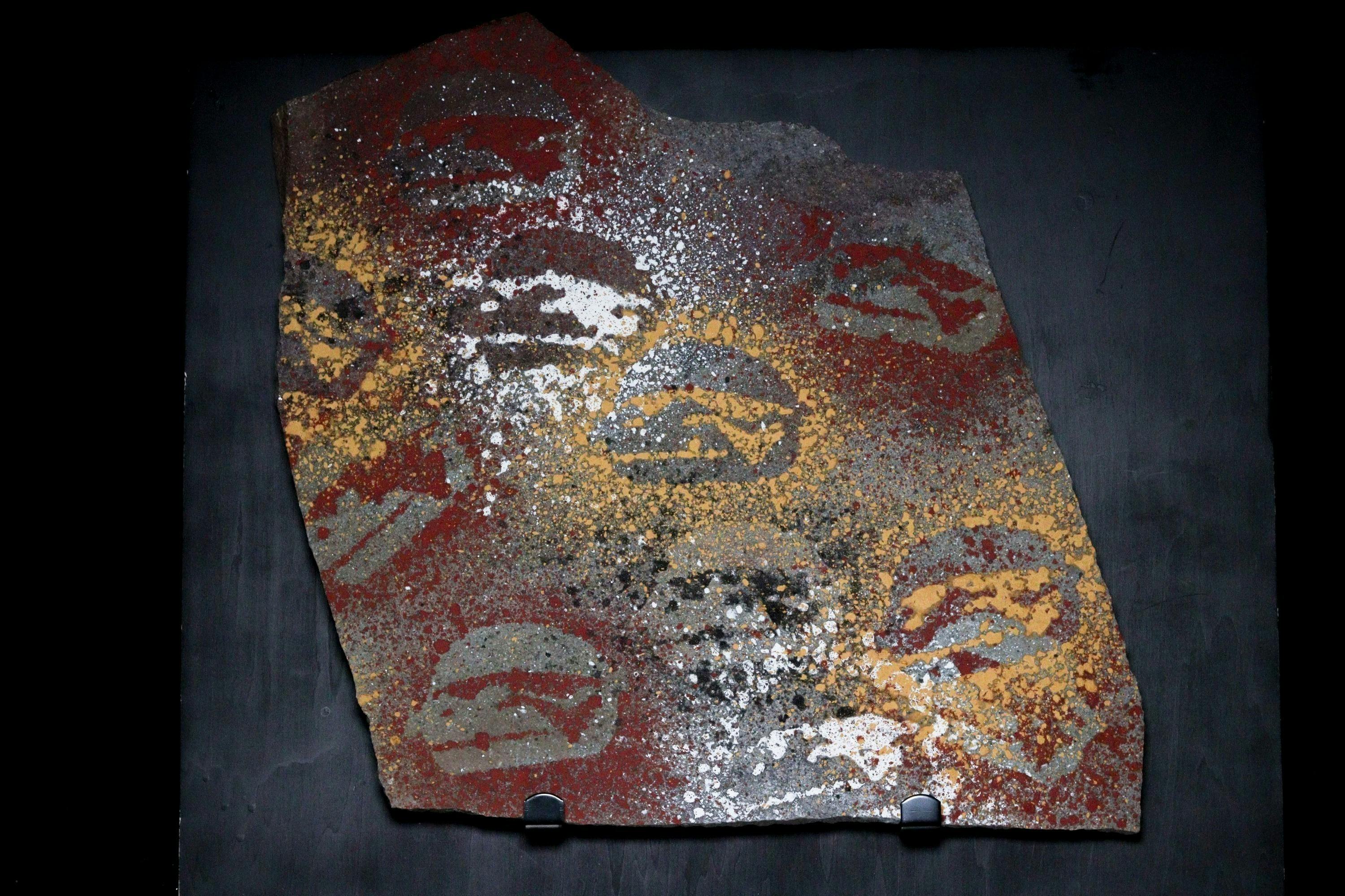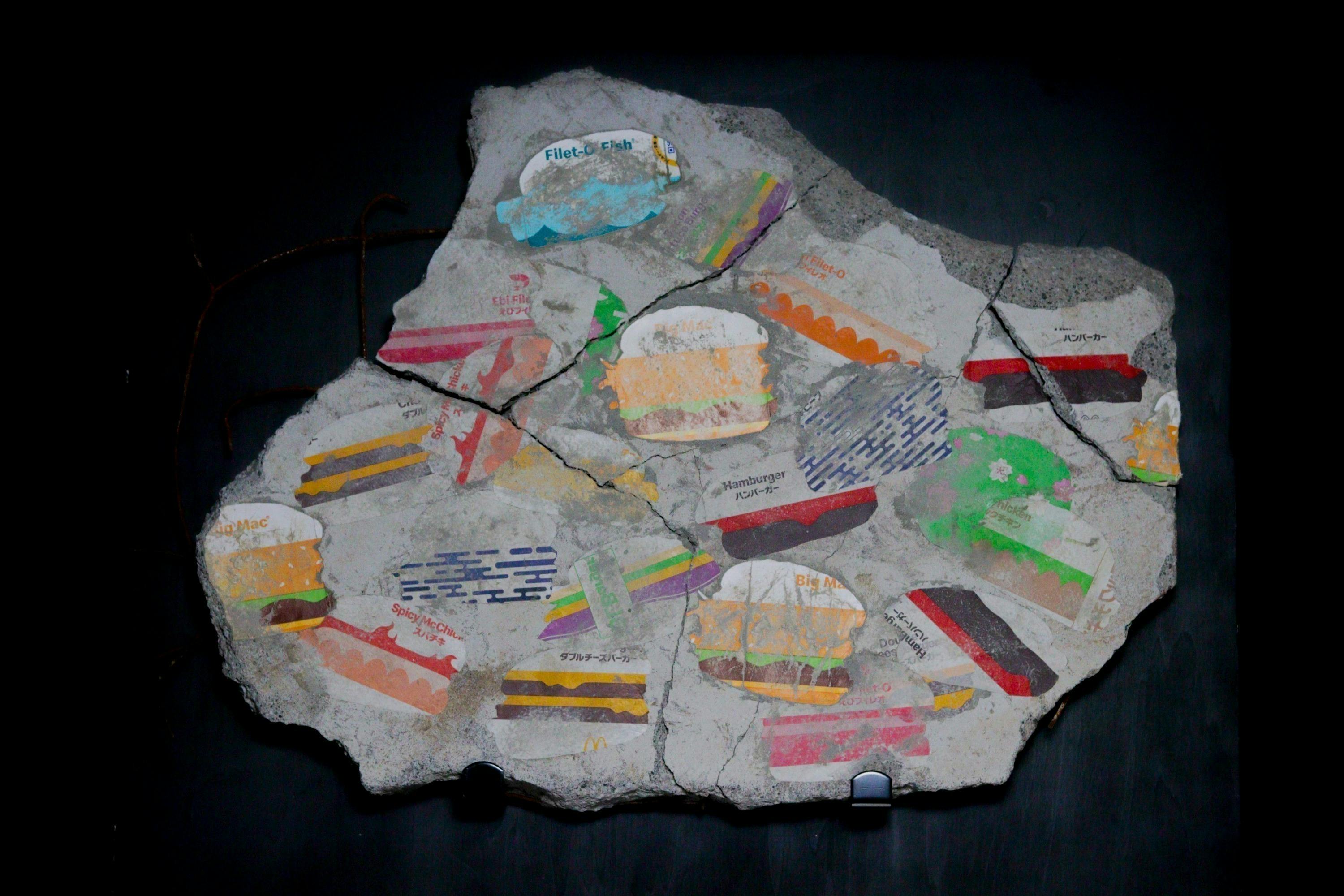 古代と同じ「石」という素材に現代の象徴であるハンバーガーの記号を刻み、最終的にそれを解体する。その行為を通して、記号化の次を問う作品が『Negative Hamburger』です。