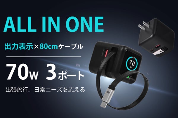 10W充電器とほぼ同じサイズ感ながら、最大70Wの高出力を実現。さらにコードリール式ケーブルも内蔵し、これ1台で充電環境がグンとスマートに。