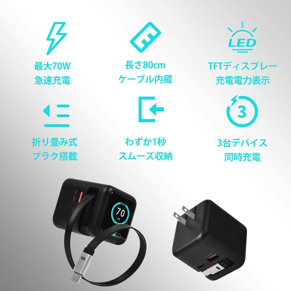 10W充電器とほぼ同じサイズ感ながら、最大70Wの高出力を実現。さらにコードリール式ケーブルも内蔵し、これ1台で充電環境がグンとスマートに。