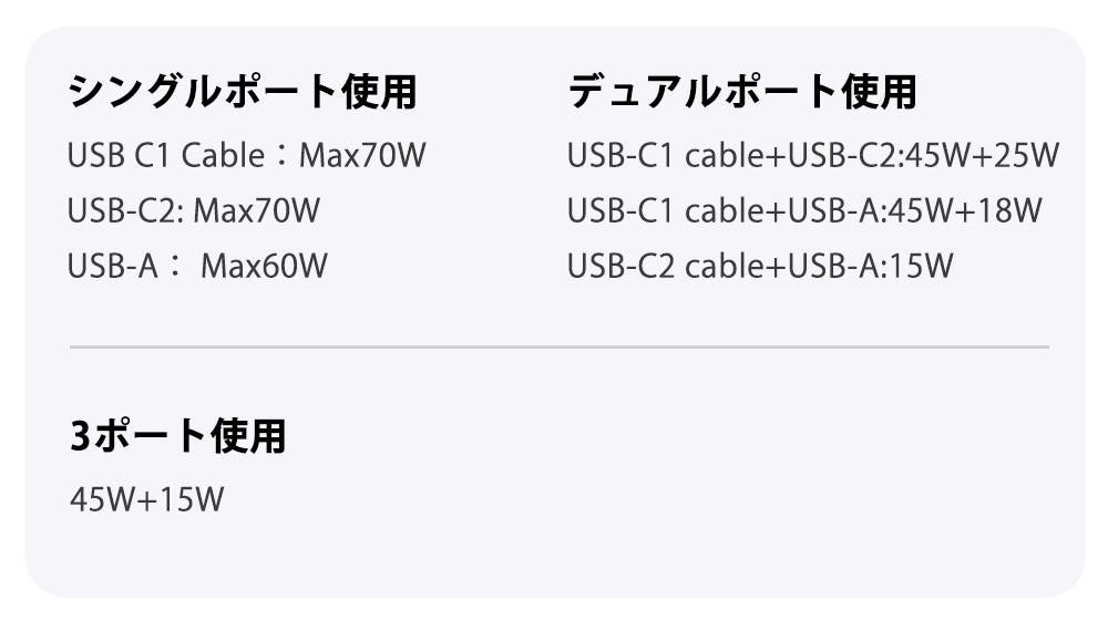 USB-Cのシングルポートで最大70W出力に対応し、ノートパソコンやタブレット、スマートフォンなど、さまざまなデバイスを高速かつ安定して充電できます。
