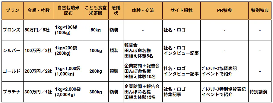 ブロンズ、シルバー、ゴールドに関しては、各リターンの詳細にて、ご確認ください。