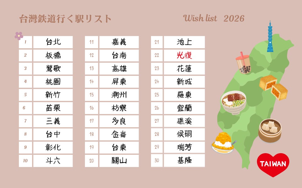現在、台湾鉄道を一周するルートはすでに決定し、観光・歴史・グルメの観点から厳選した30駅をリストアップしています。