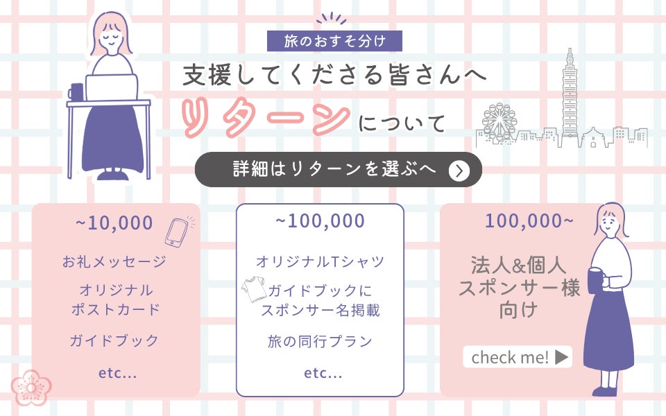 リターンは、支援してくださる皆さんに「旅のおすそ分け」をお届けできるよう、さまざまな内容をご用意しました。