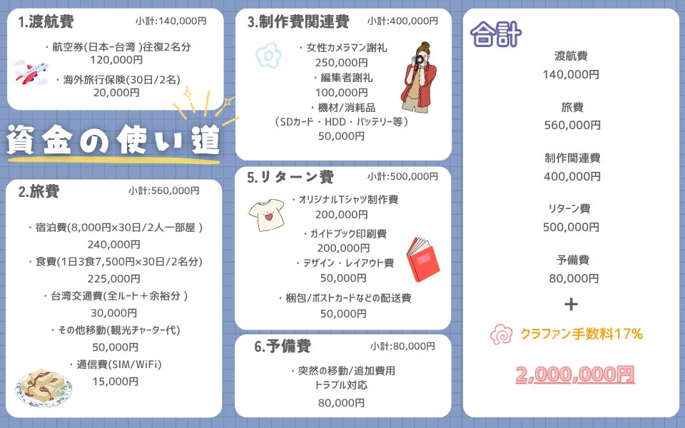 また、撮影した映像は日本の方だけでなく台湾の方にも楽しんでいただけるように、YouTubeに日本語と台湾華語の字幕を入れる予定です。そのための編集スタッフの費用も加えています。