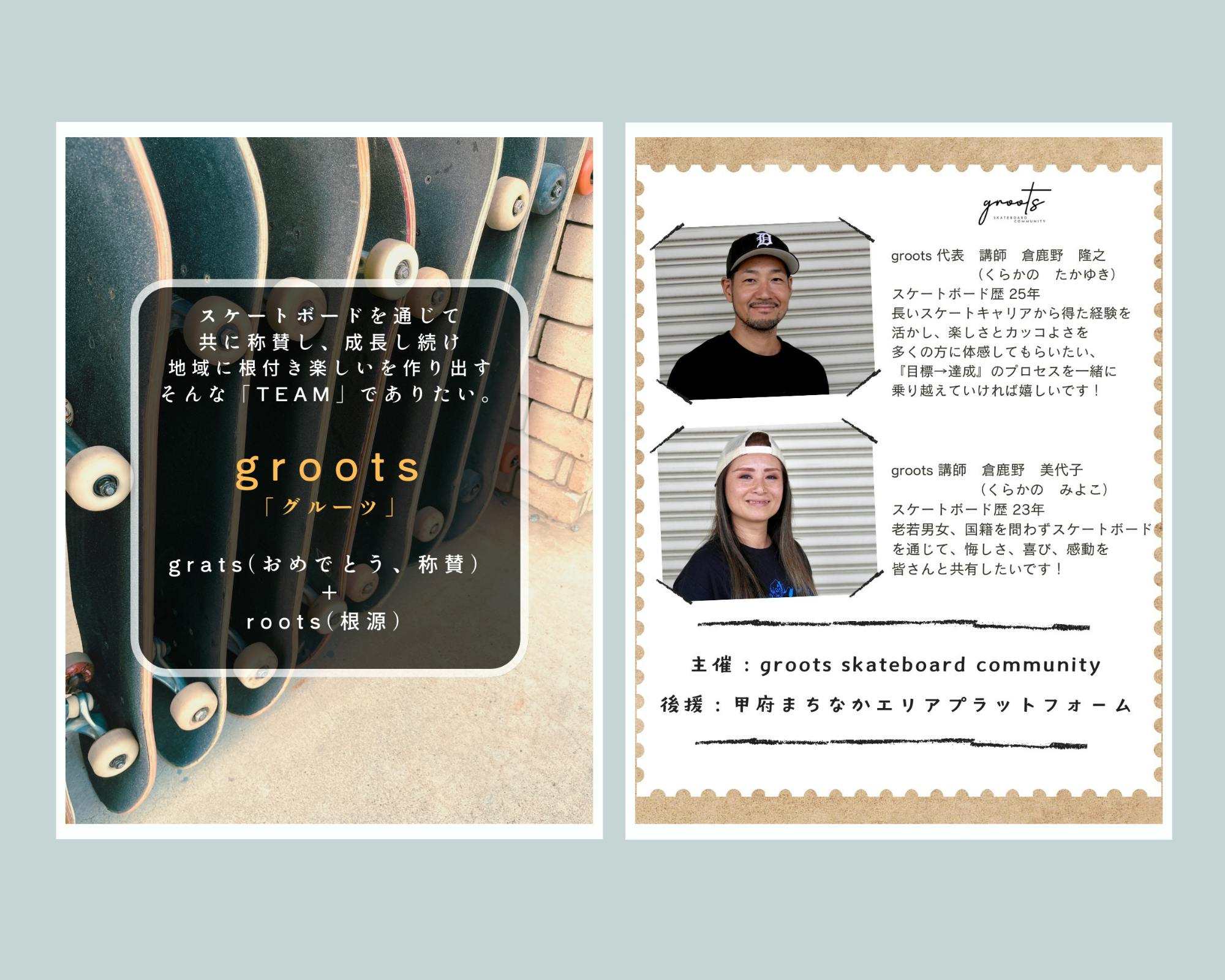 現在はスクールやイベントなどでスケートボードを普及させるため「groots skateboard community」(グルーツスケートボードコミュニティー)という団体を個人事業として立ち上げ活動しております。