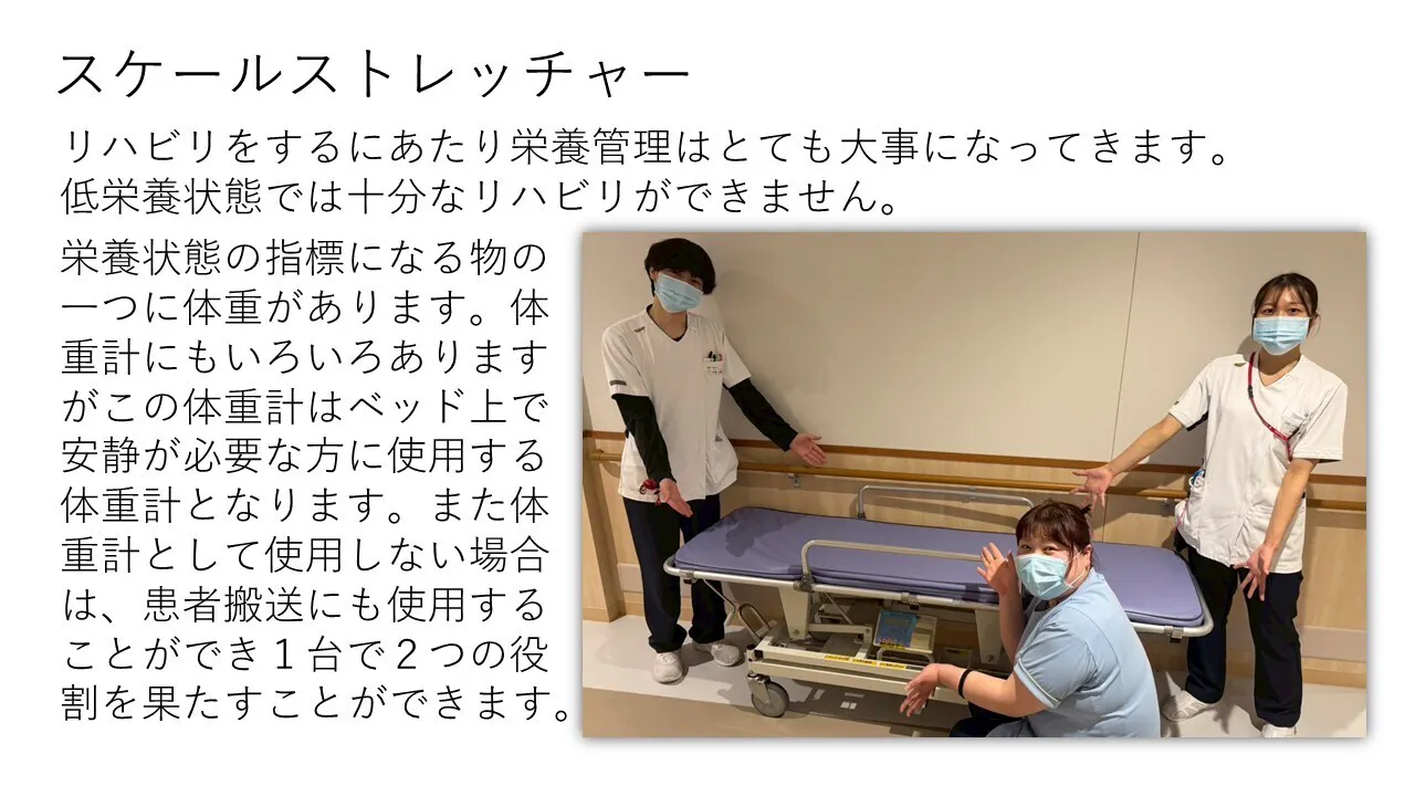 プロジェクト会議の様子2025年5月にリニューアルしましたが、建設費用の高騰により当初の計画より床面積も小さくなり、それぞれの部署で必要なものも最低限度に抑える必要がありました。病院が新しくなったタイミングで備品も新しくしたかったところですが、費用を抑えるためにこれまでのものをもってこざるを得なかったことも数知れません。さらにリニューアルとは関係なく、一般的に病院の備品購入に際しては、その備品を買うことでどれだけの収益が上がるかを示す必要があります。つまり収益が上がらない備品を買うためにはそれがないと日常診療ができないなどの理由が必要となります。今回のプロジェクトで購入を予定している備品はこのような理由があるものです。例えば、リハビリ室から要望があった電気刺激装置です。院内の研究発表会でも電気刺激療法を行うことでエビデンスに基づいた治療ができることがわかっていましたが、この電気刺激装置での電気刺激療法は診療報酬での収益をえることはできず、これまではデモ機をしようしていました。デモ機返却に伴い自前で購入する必要があったのですが、診療報酬からの収益が上がらない装置であるために購入には至りませんでした。病棟から要望があったスケールストレッチャーは臥床したままで体重が測れるストレッチャーです。当院ではパーキンソン病や廃用症候群のために低栄養になっている方が少なからずいます。この方たちの栄養状態のモニタリングのためには体重測定が不可欠ですが、車いすにも乗れない状態だと体重を測定することもできず、このスケールストレッチャーが必要となります。体重測定だけで診療報酬での収入はなくこれも病院で自前に購入する必要があります。放射線部門から要望があったCD-Rプリンター(パブリッシャー)は当院から他院への紹介の際に当院で行ったCTやMRIなどの画像検査を添付するCD-Rを作成する機器です。