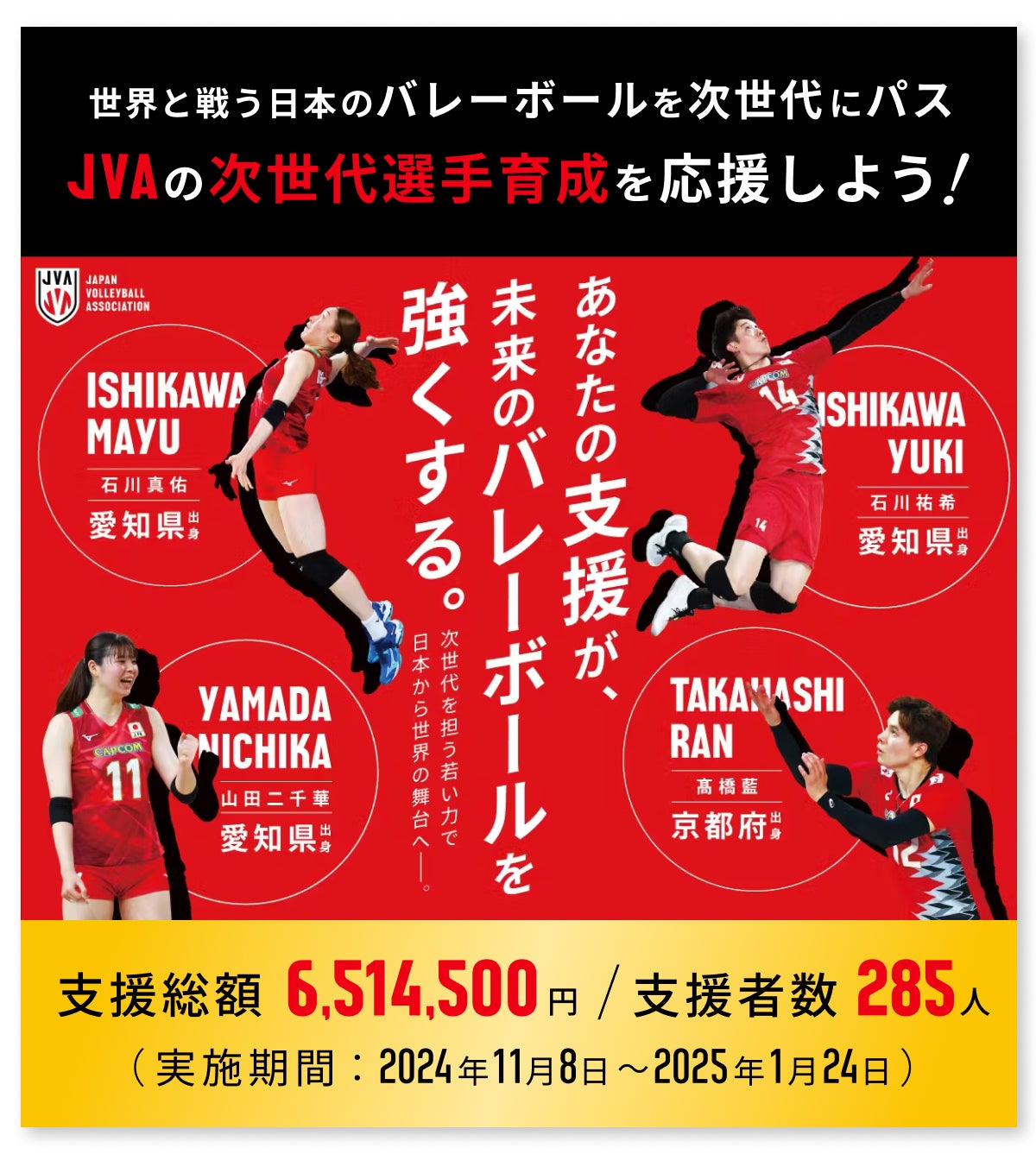 初めての挑戦でありながら、これほど多くの方が「未来の代表選手を育てたい」という想いを共有してくださったことは、JVAにとって大きな励みとなりました。そして今年、私たちはこの取り組みをさらに広げるために、第2弾をスタートします。