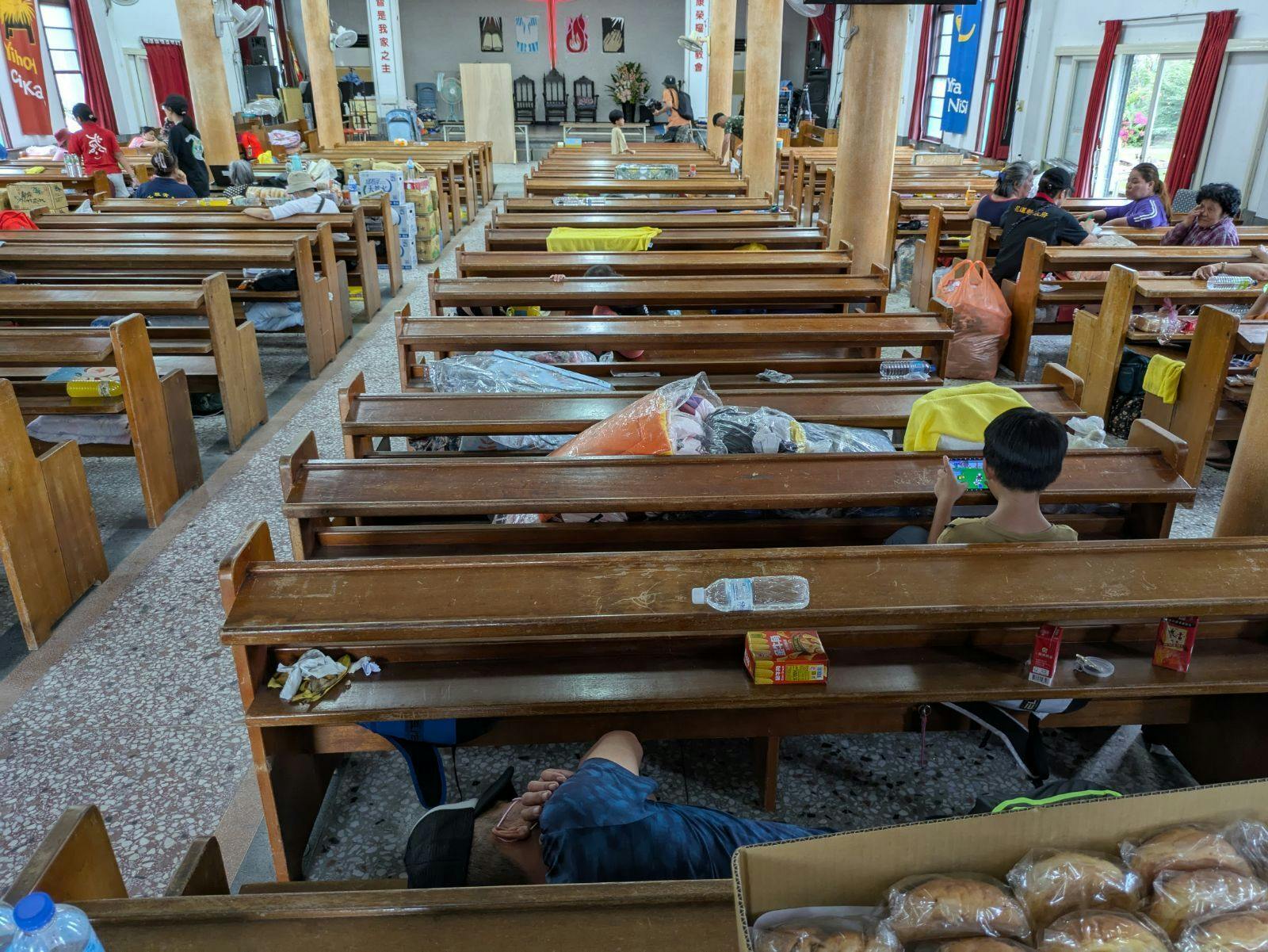 寝返りも打てない狭いベンチで寝る避難者。長引く避難生活を見据え、就寝スペースを確保する提案も行っている(9月26日、花蓮県光復郷の避難所にて)