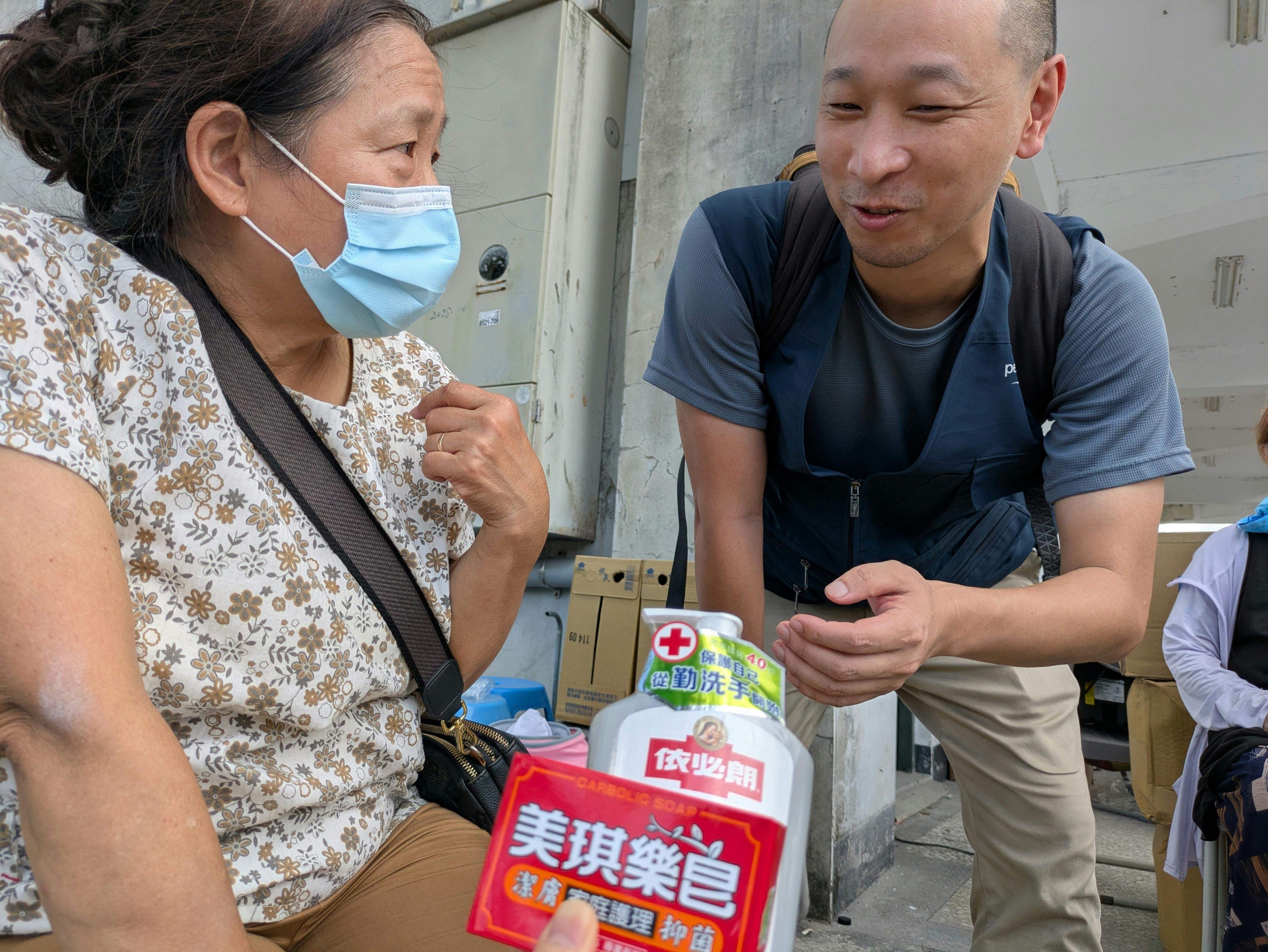 避難所内での感染を予防するため、ハンドソープなどの衛生用品を配付する(9月27日、花蓮県光復郷の避難所にて)