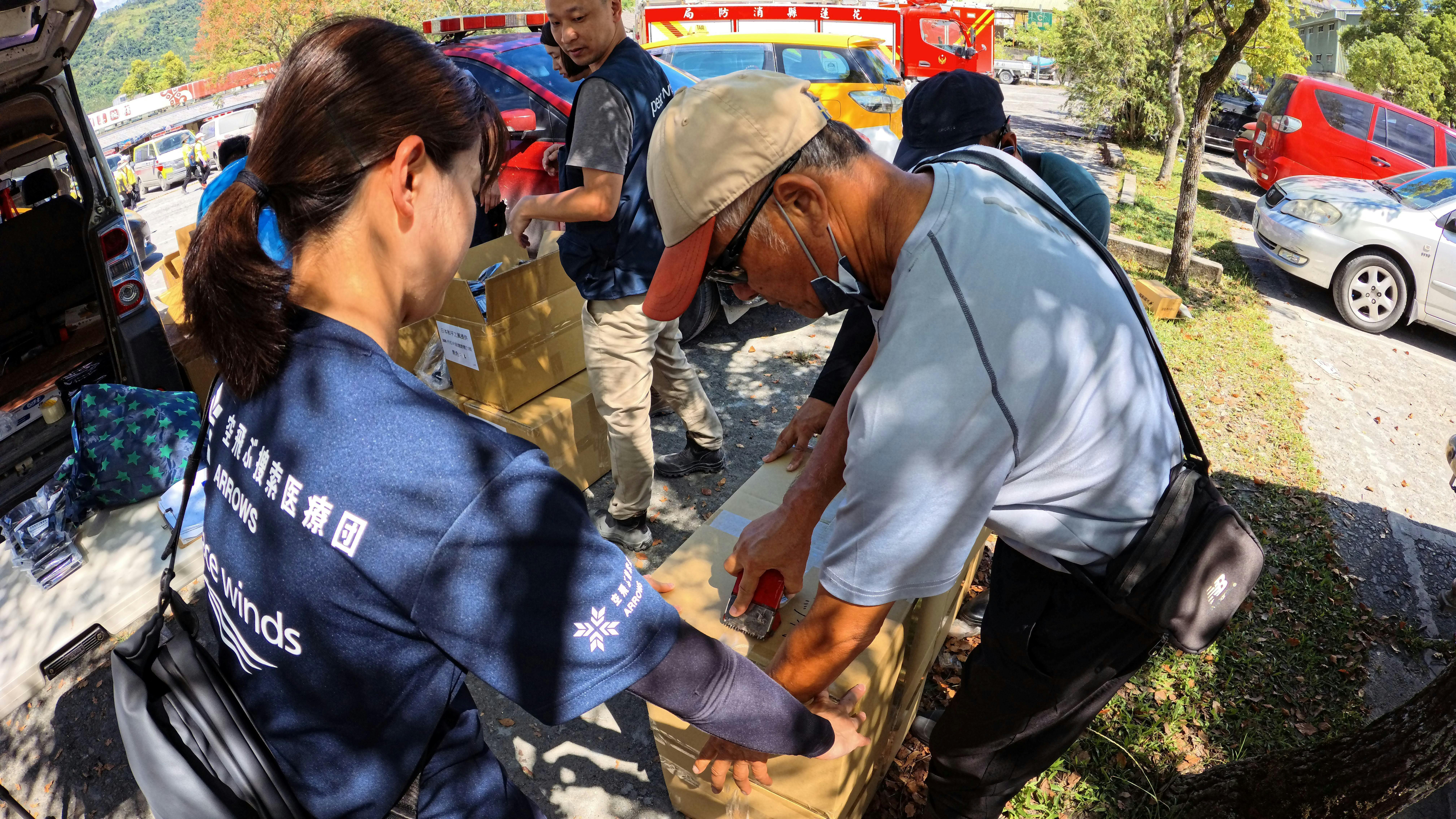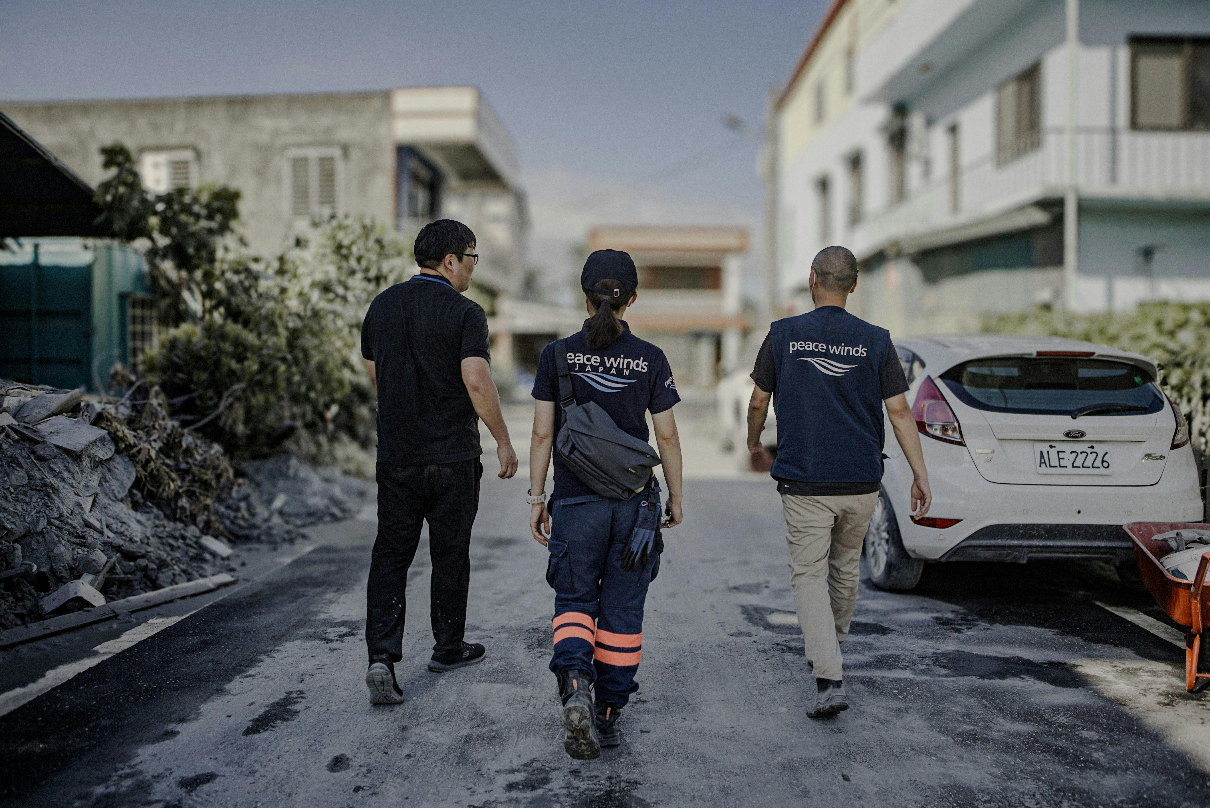 被災者の声を直接聞くために、ニーズ調査を続ける空飛ぶ捜索医療団とピースウィンズ台湾のスタッフ
