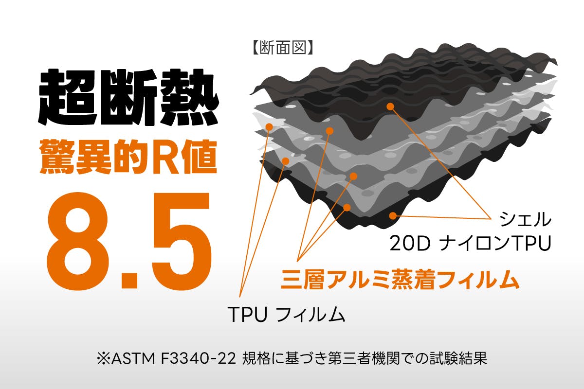 内部には、三層の両面アルミ蒸着フィルムをTPUフィルムで重ねることで、高い断熱性を実現しています。