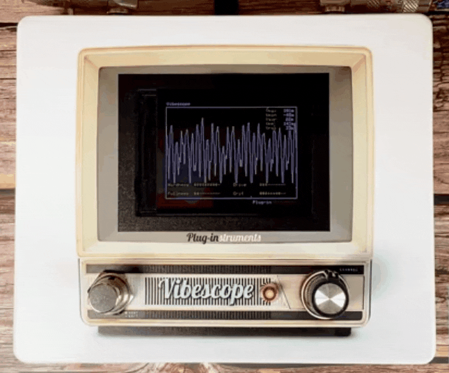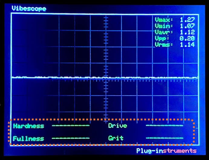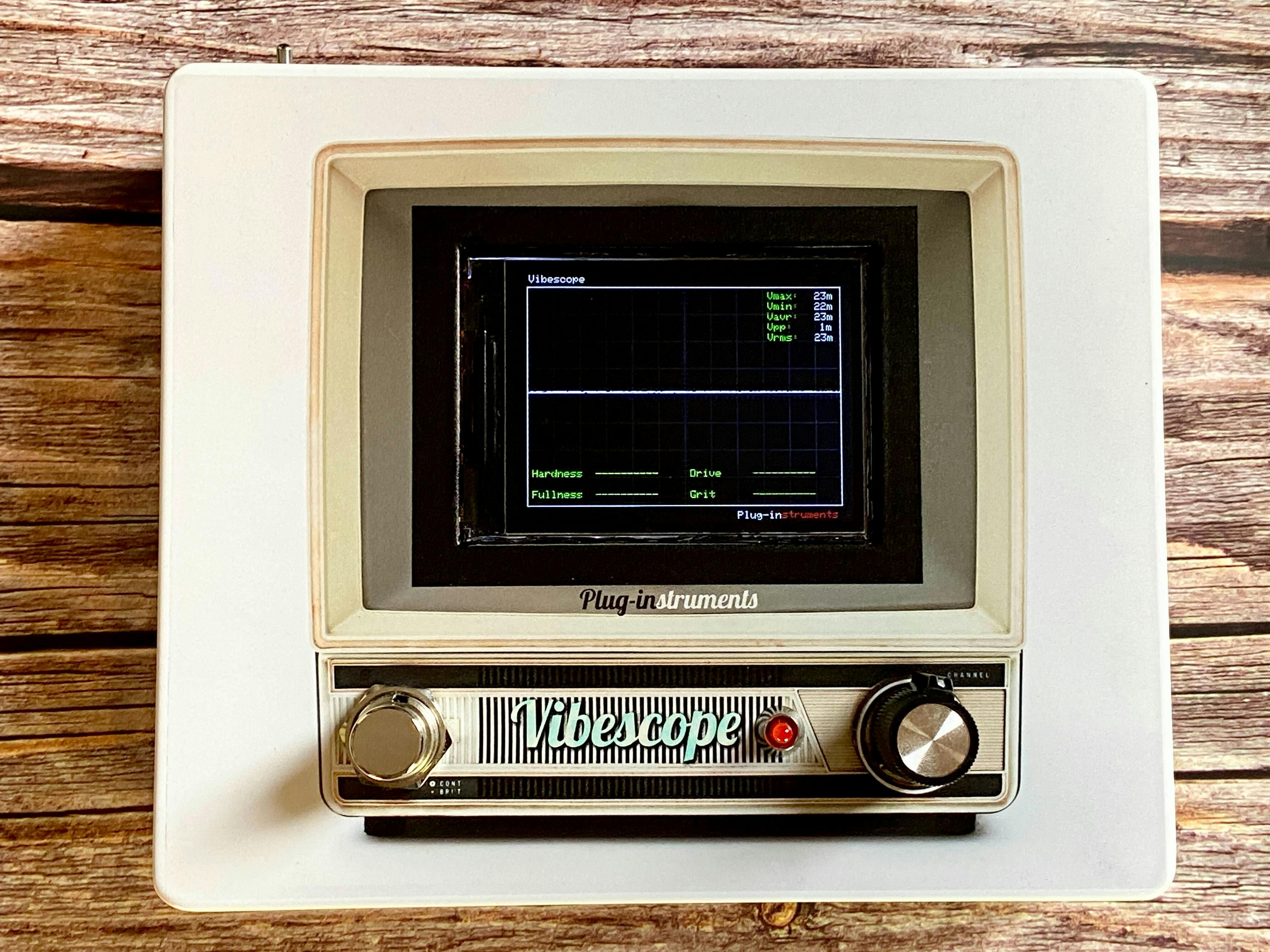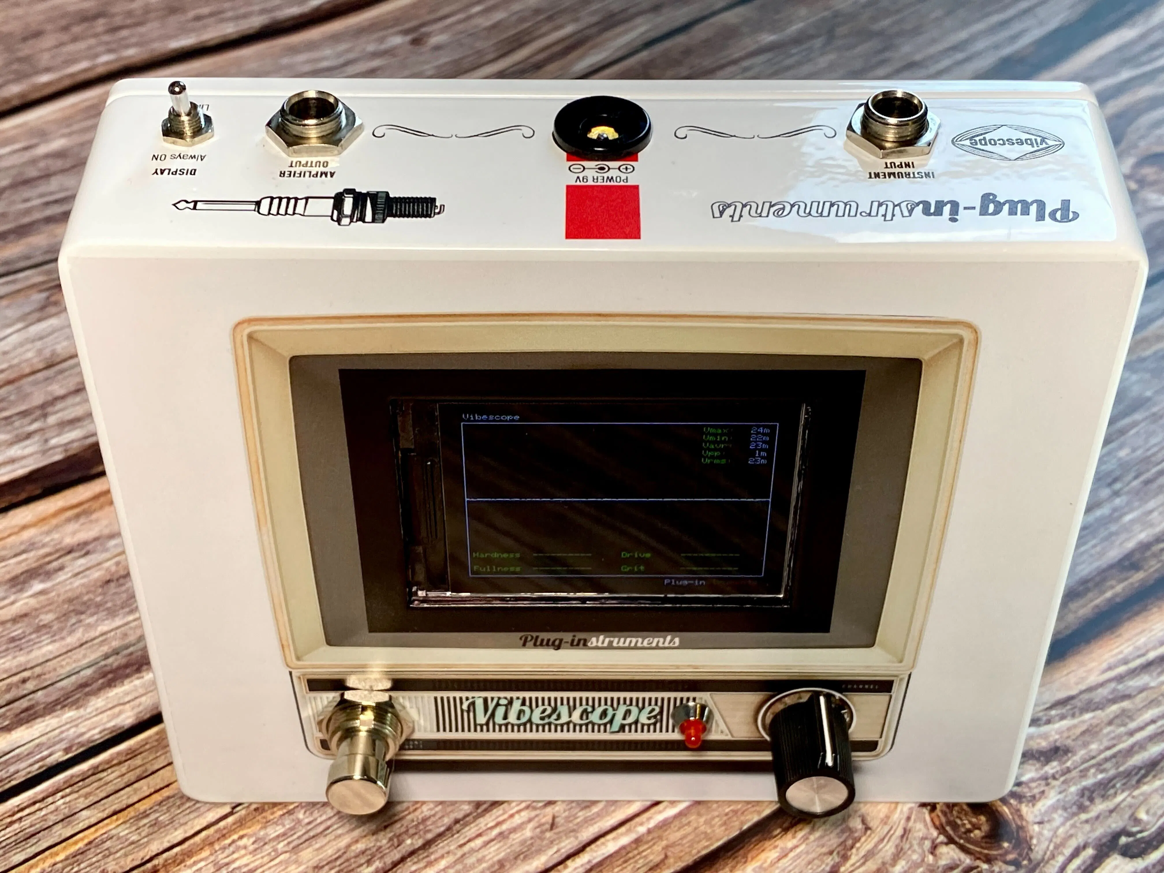 Vibescopeでは、その中央にあしらわれたモニターに、入力されたギターの音を時間と電圧の波形として表示します。