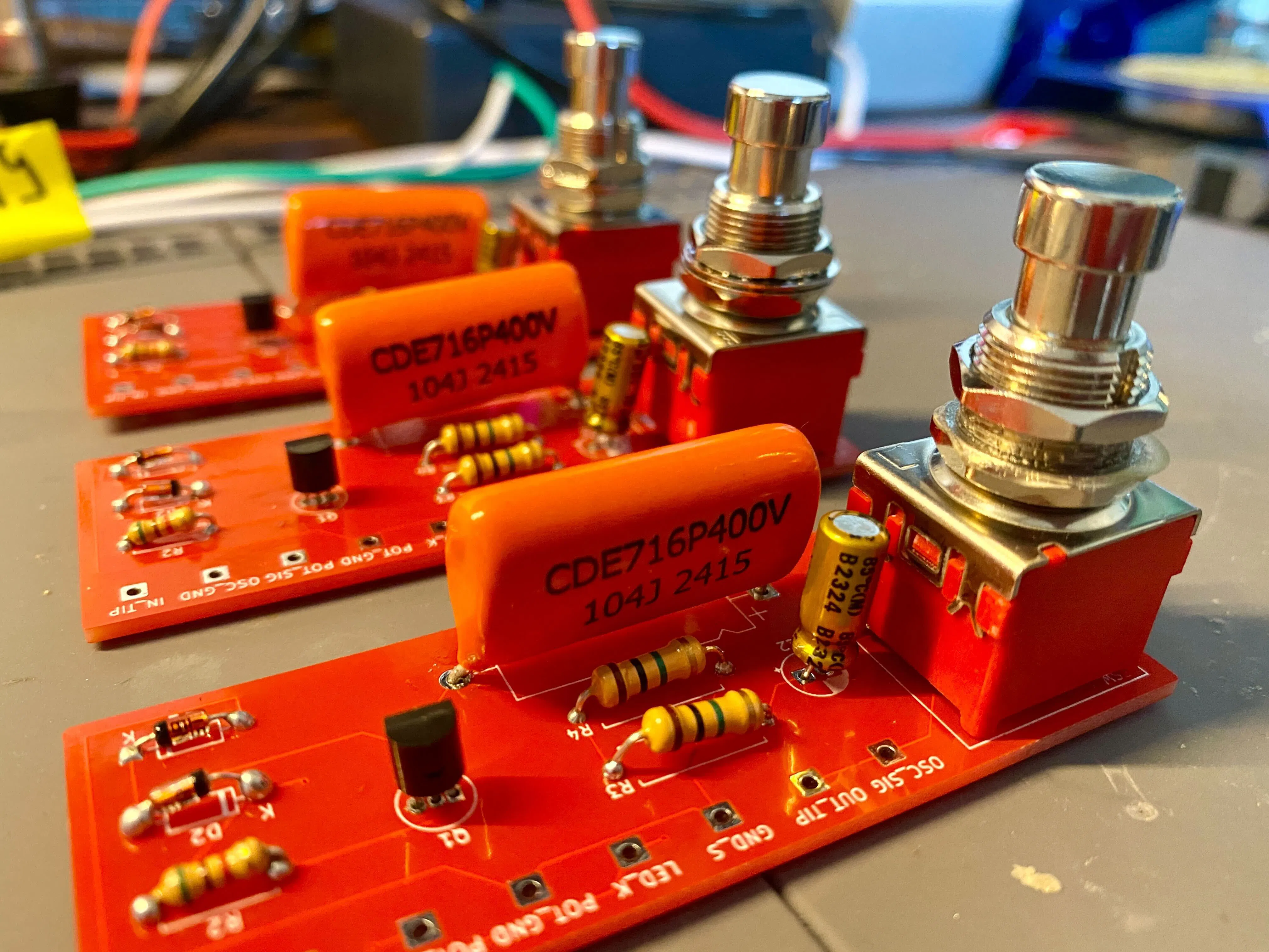 Vibescopeのワンノブ・ブースター部はオリジナル基板となっており、シンプルな設計ながらピックアップのサウンドキャラクターをロスなく伝え、ギターの種類を選ぶことなくその存在感だけをウォームかつクリアに増幅させます。