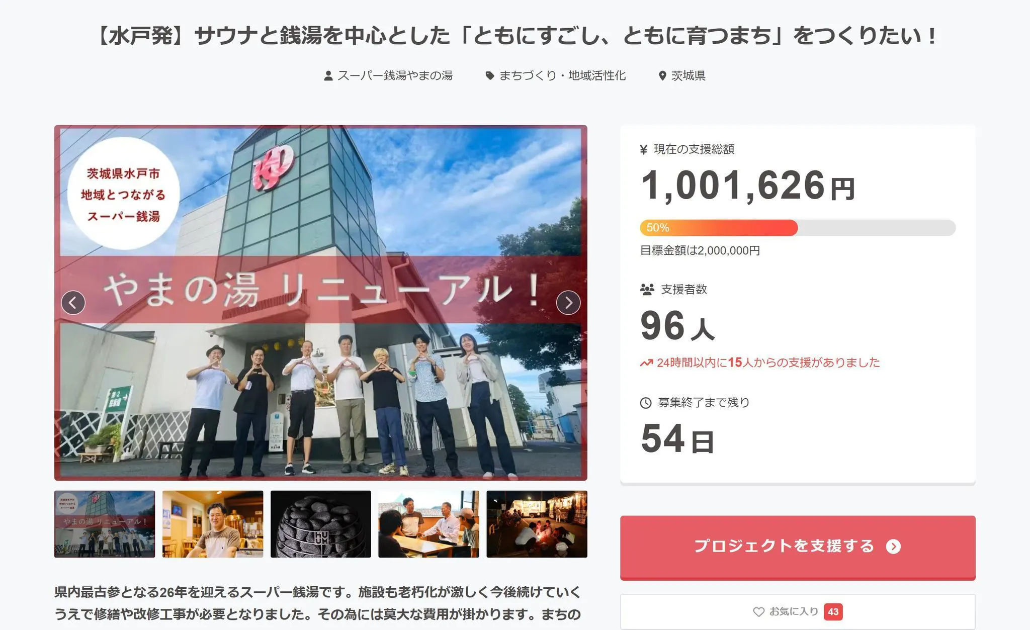 10月4日(土)やまの湯開業26周年の節目に、初めてクラウドファンディングに挑戦させて頂きました。おかげさまで予想をはるかに上回る反響にて、わずか3日間で支援額100万円、50%を達成することができました!!