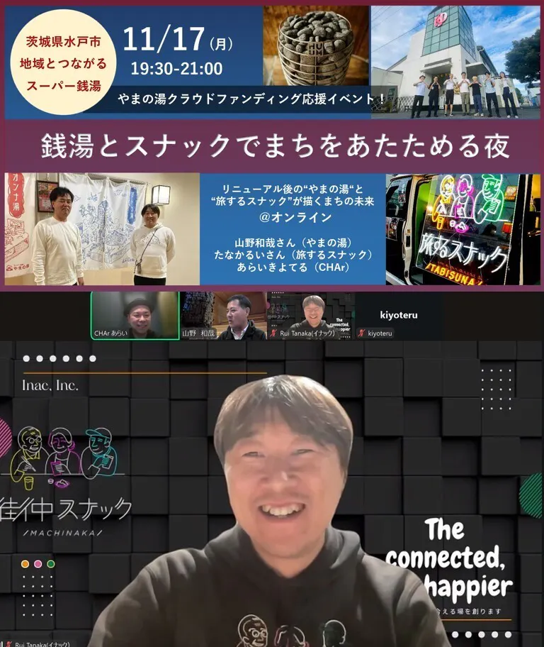 当日はやまの湯の山野さん、街中スナックのたなかさん、NPO法人CHArのあらいさんが登壇し、プロジェクトの全体像、リニューアルの狙い、そしてクラウドファンディングに挑戦することの意味について語り合いました。