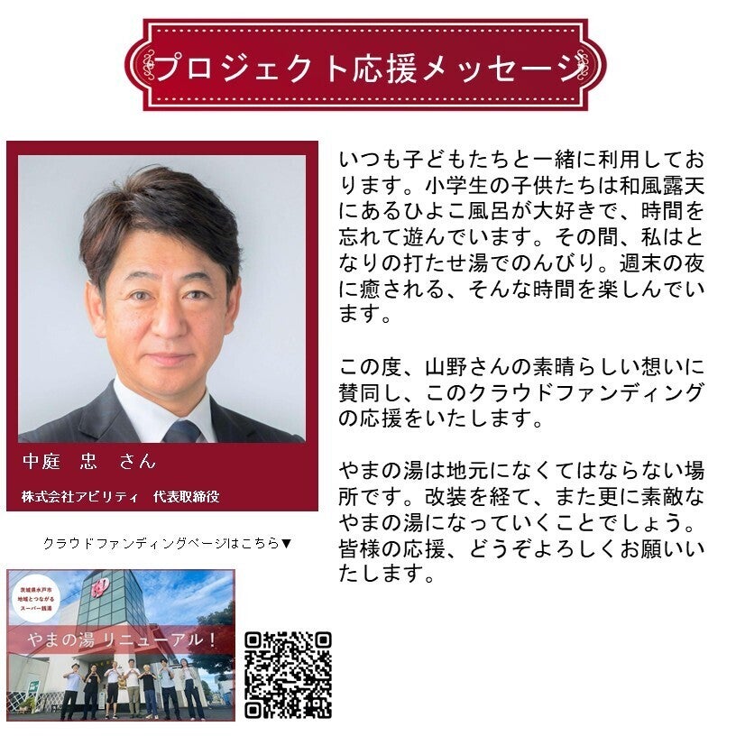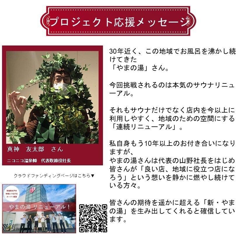 また、暖簾掲載のように「やまの湯に名前が残る」リターンもご用意しています。