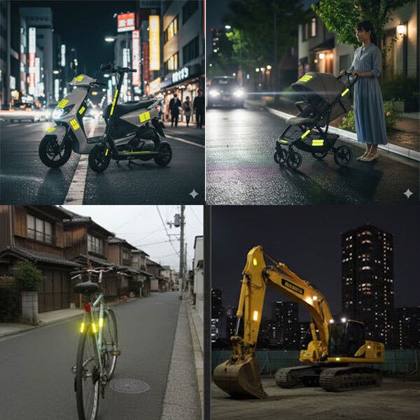 私たちのステッカーは、車のヘッドライトの光をまっすぐに跳ね返す**「再帰反射」**構造を採用しています。闇に溶け込んでいたあなたやあなたの乗り物が、光が当たった瞬間に強烈に発光し、ドライバーに存在を知らせます。圧倒的な視認性: 昼間は目立たず、夜間に光を当てた時だけ強く反射します。プロ仕様の耐久性: 強い雨や泥、水洗いにも耐える防水・耐候性素材を使用しています。****簡単貼り付け: 剥がして貼るだけの簡単設計。ヘルメットの曲面にもフィットします。****