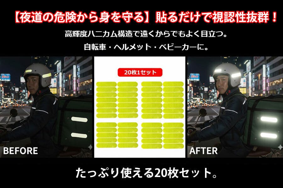 20枚1セットだからこそ、様々なアイテムに貼って、家族の安全を網羅できます。パパ・ママのために: バイク・自転車のヘルメット、デリバリーバッグ、通勤用バッグに。お子様のために: ベビーカー、ランドセル、習い事のバッグ、自転車に。作業される方のために: 電動スクーター、工具箱、作業着、工事用ヘルメットに。