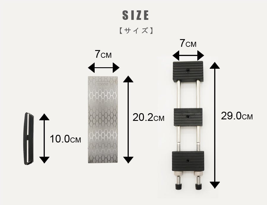 サイズ:両面ダイヤモンド砥石29cm×7cm、角度固定補助クリップ10cm、伸縮式ラバー固定台29cm×20.2cm