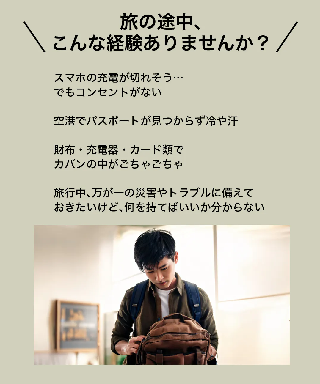 「スマホの充電が切れそうで不安」「パスポートやカードをどこにしまったか一瞬焦る」「大事なものが増えて管理がバラバラになる」。