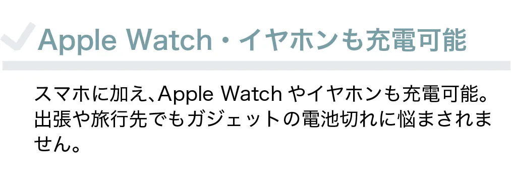 A.はい、できます!本製品はスマートフォン(最大15W)に加え、イヤホン(最大5W)、Apple Watch(最大3W)の充電が可能です。