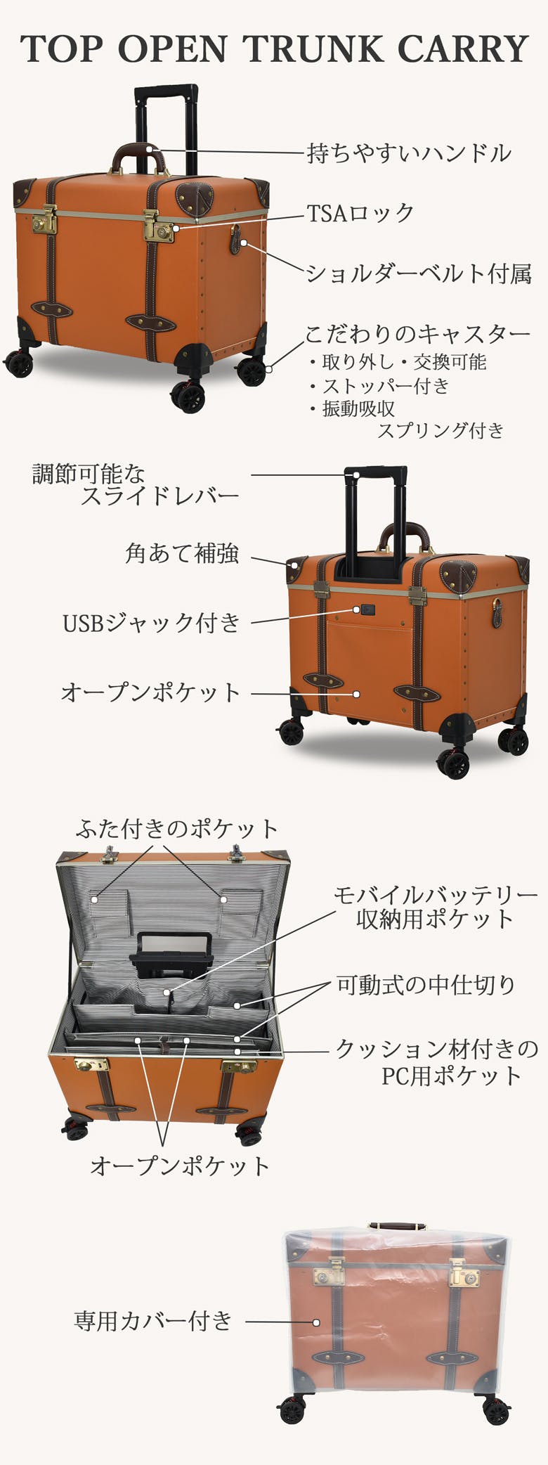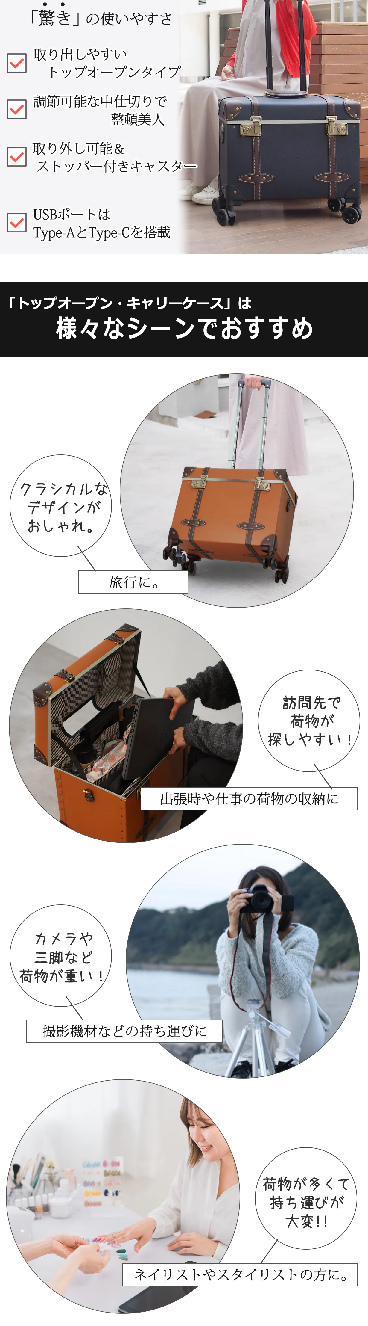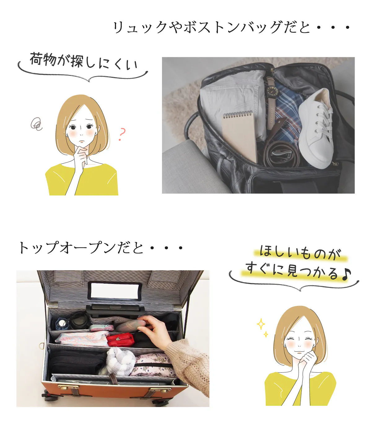 トップオープン・トランクキャリーは、長年培ってきたノウハウを生かし、作り上げた商品となりますので、旅行やお仕事の相棒として末永くお使い頂ける商品と考えております。