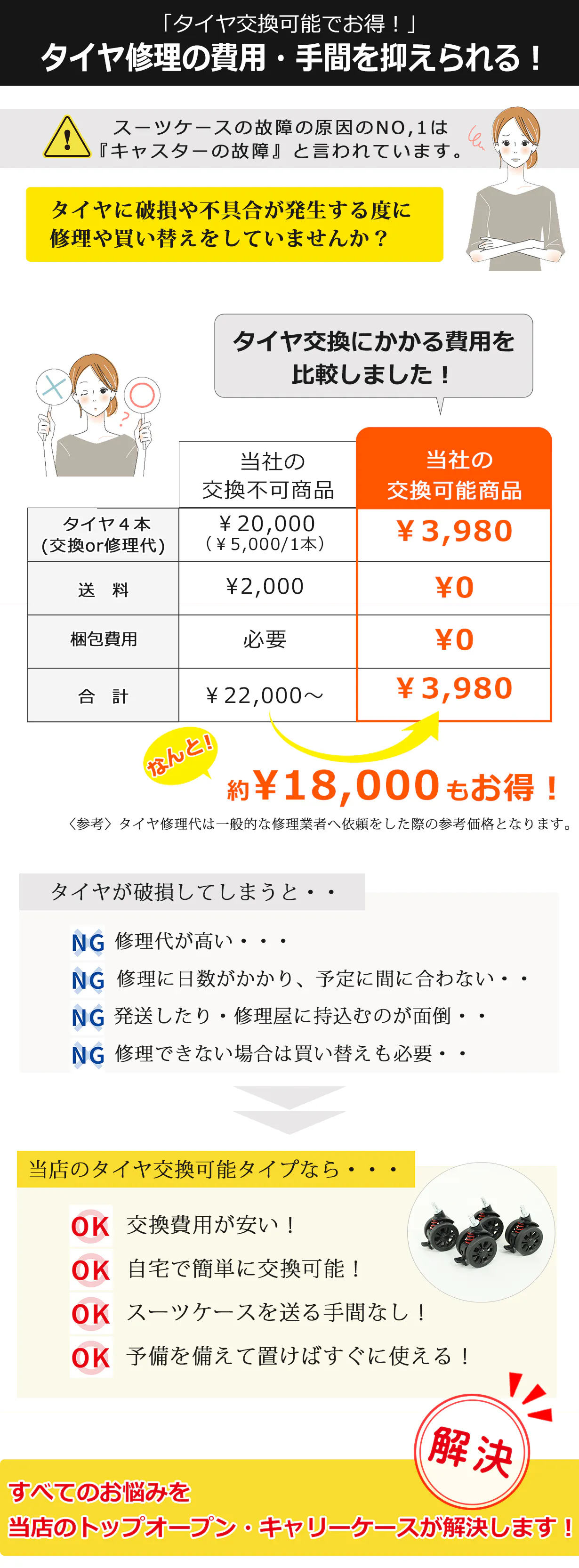スーツケースの故障の原因で一番多いのがキャスター部分。万が一修理が必要になっても、キャスターを取り替えるだけでOK。修理に出す必要がないので、修理費用を抑え、手間を省くことができます。