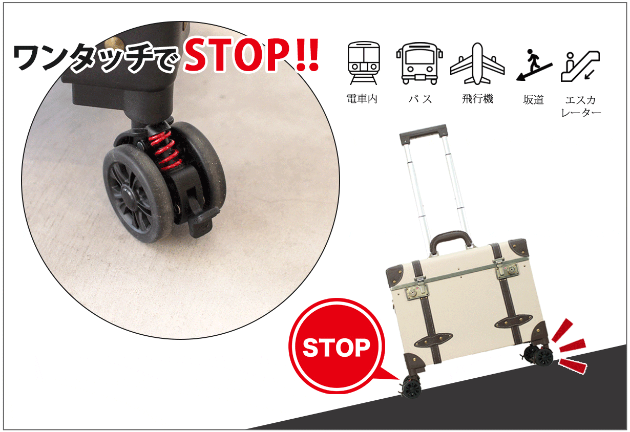 電車内や坂道で・・スーツケースを支えておくのは大変!そんな時にはキャスターストッパーが便利!