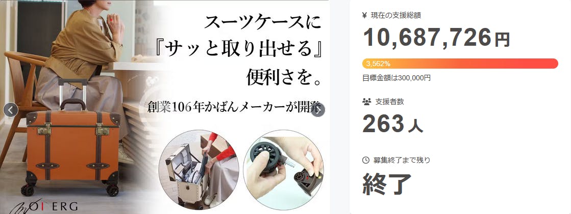 2026/01/15 12:00支援者様のおかげで今現在、目標達成率2636%を達成しており心より御礼申し上げます。支援者の方々からは、「トップオープンが画期的で、尚且つデザインに一目惚れしました! 一般的なトランクよりはやや高めなので悩みましたが、やはりどうしても欲しくて購入します!」「ステキなトランクですね!!応援しています!」「同型シリーズ愛用しています」「このキャリーケースで旅行に行くのがさらに楽しくなりそうです」「とても使いやすく、デザインも大変気に入っています。交換用キャスターを買い損ねていたので助かりました。今回も大人気間違いなしですね!」「前回ネイビーをお迎えし、月2回以上は帰省や旅行に使っております。デザインも可愛く、外でも開けやすく、思ったよりもたくさん入るので重宝しております」と沢山のレビューを頂いております。そんな商品をCampfire価格で入手できるのも残り10日となりましたので是非この機会にいかがでしょうか!!!㈱龍屋半左衛門HALF THE EMON(ハーフ・ザ・エモン)MOIERG(モアエルグ)石原和幸より もっと見る